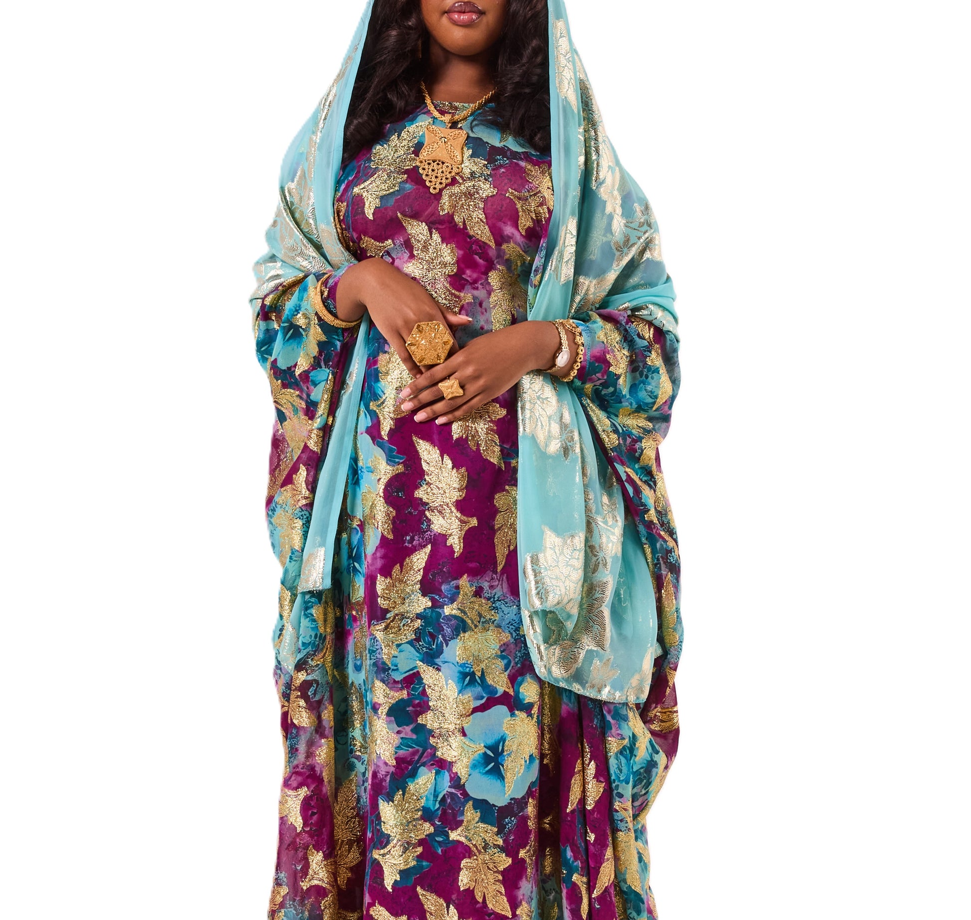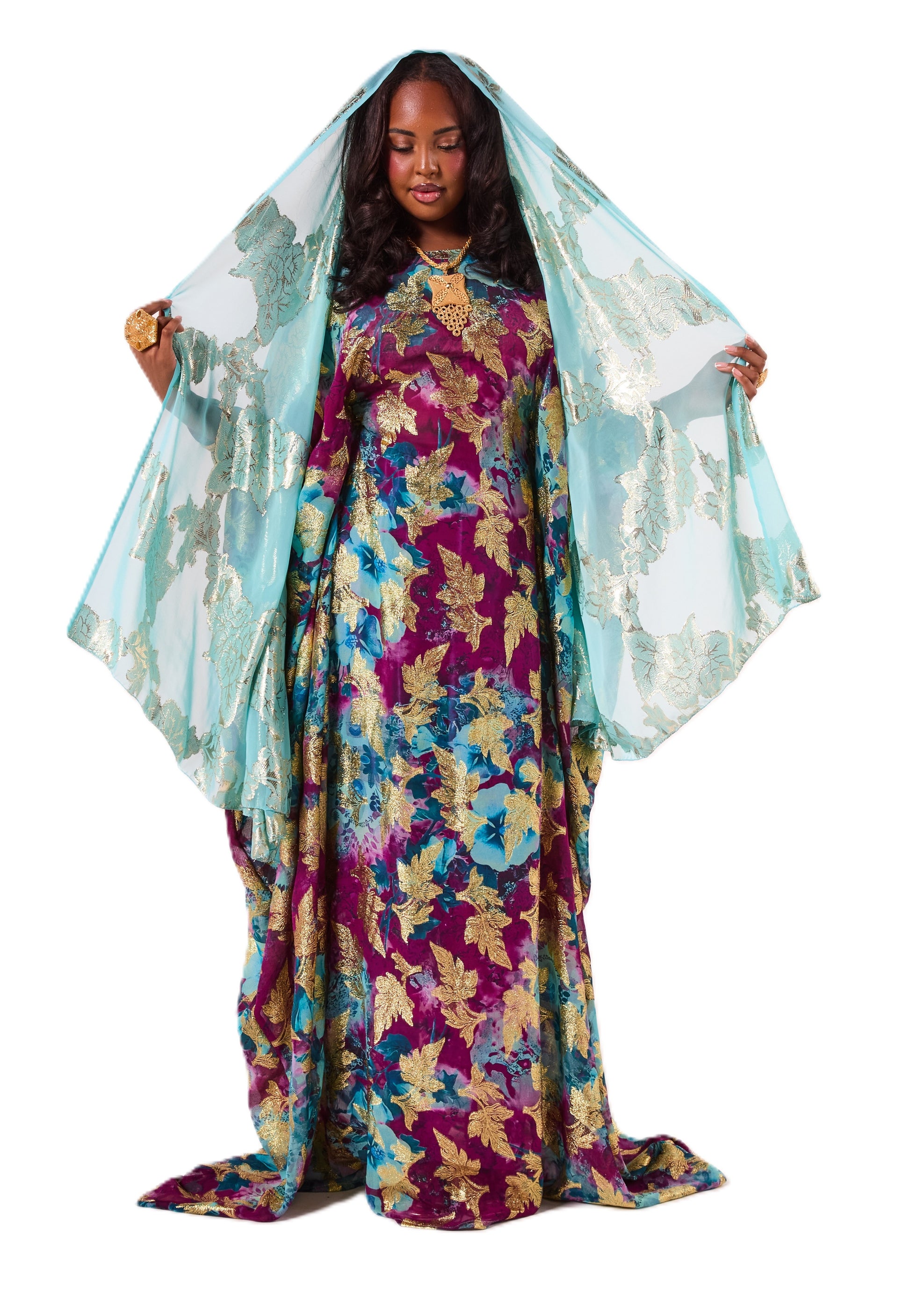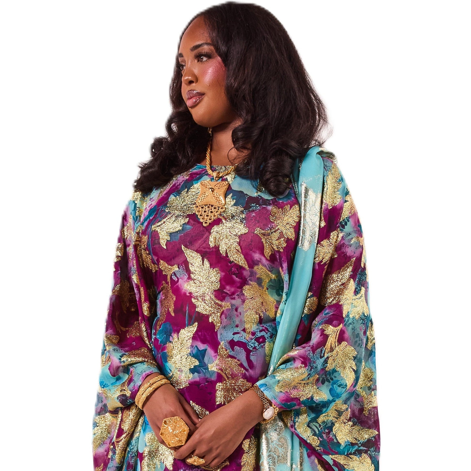 This Dirac features a vibrant blend of rich purple and turquoise tones with shimmering gold leaf detailing for a bold, eye-catching look. It comes with a soft turquoise scarf that adds a graceful finishing touch.