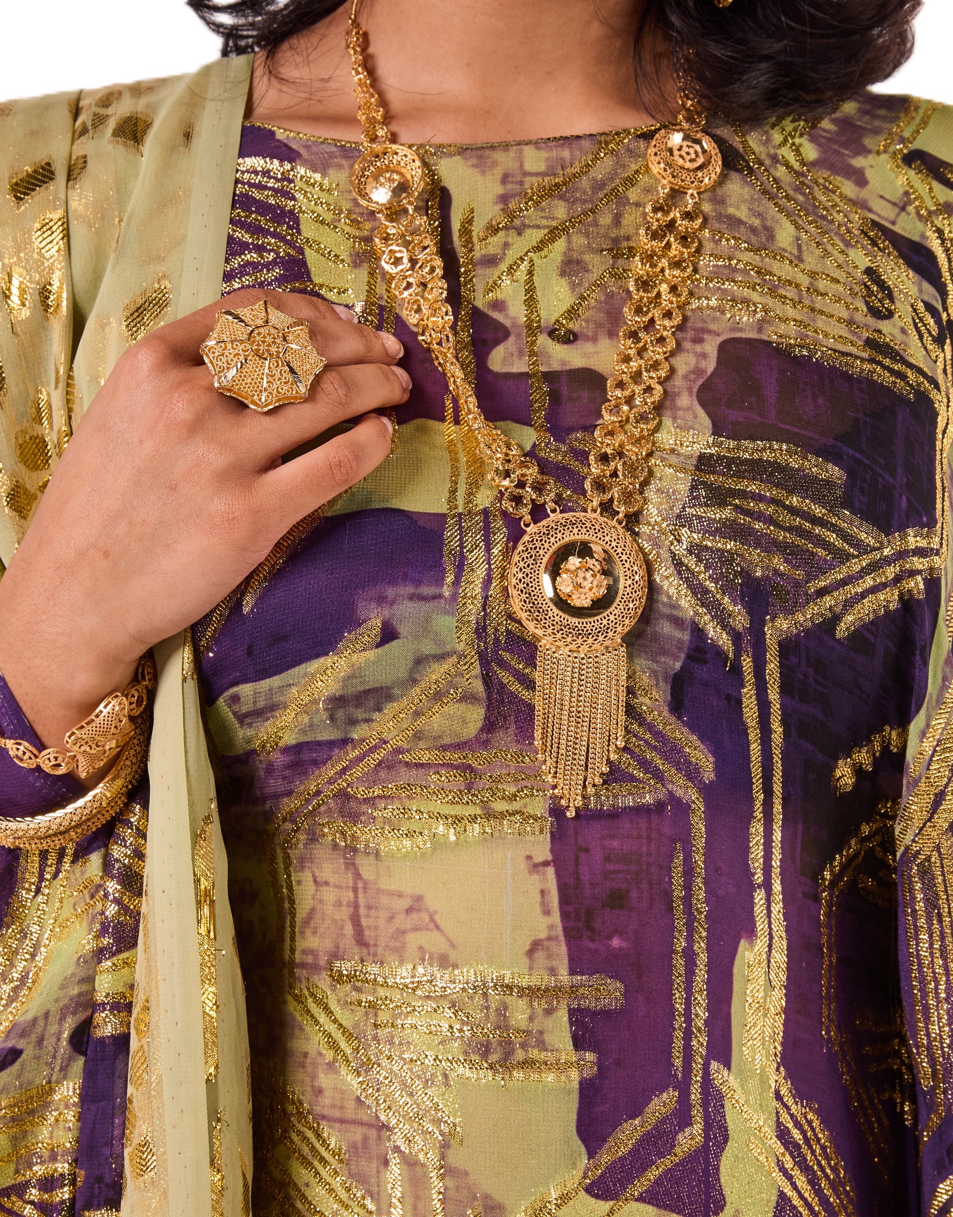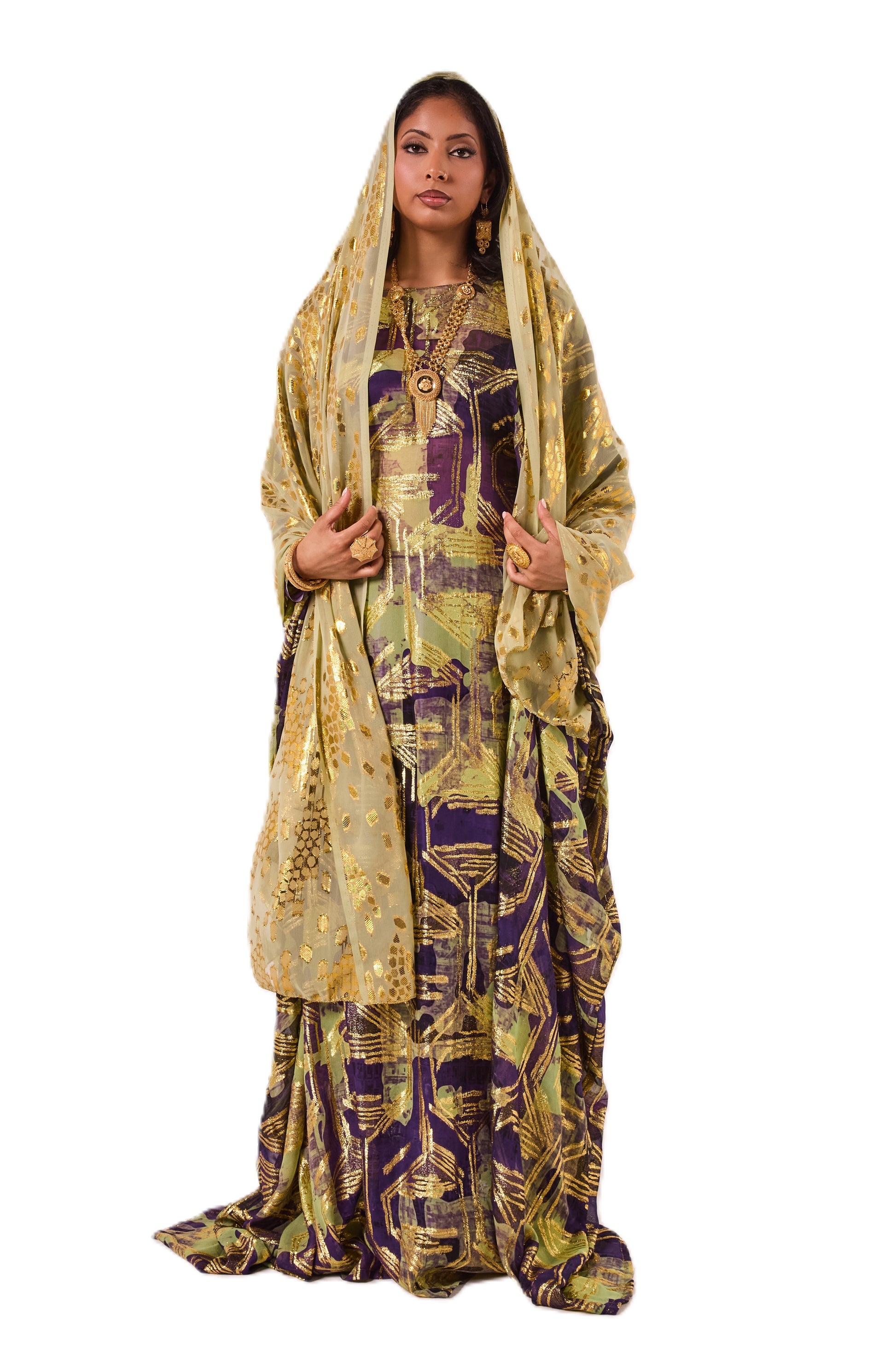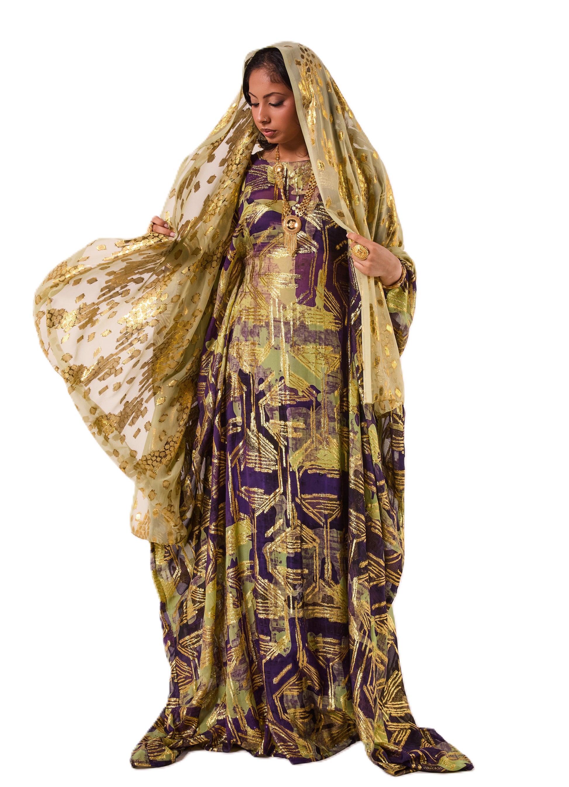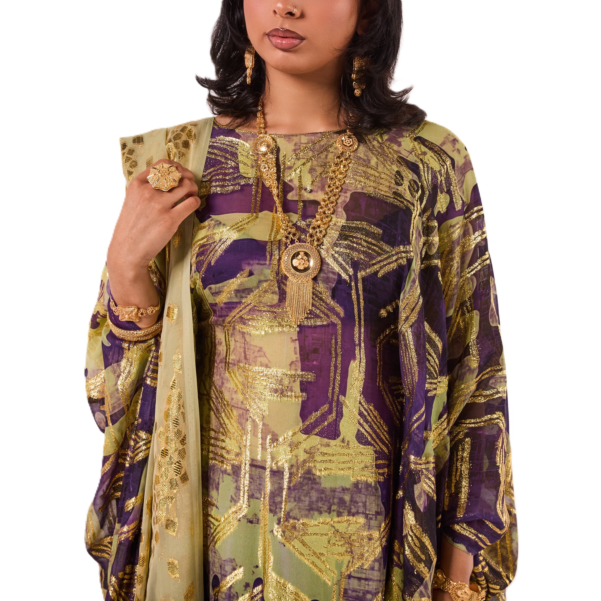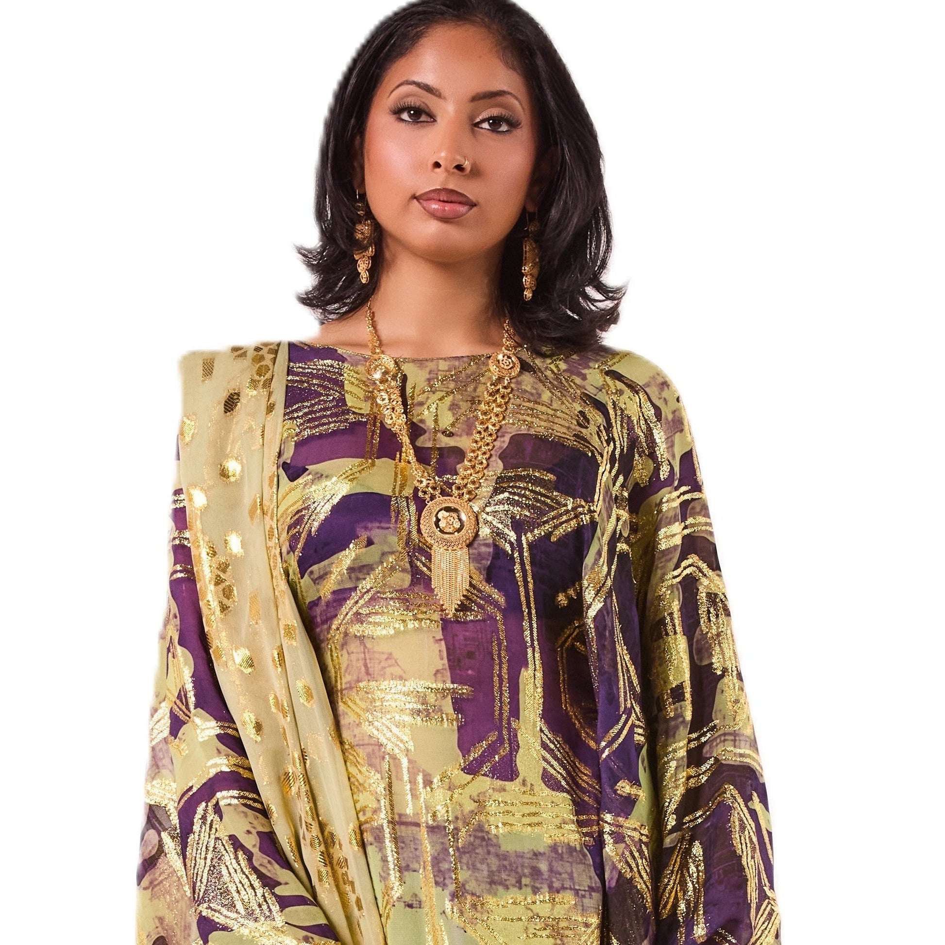 This Dirac features a rich purple and olive base with striking gold abstract detailing for a bold, elegant look. It is paired with a soft gold scarf that adds the perfect touch of shimmer.