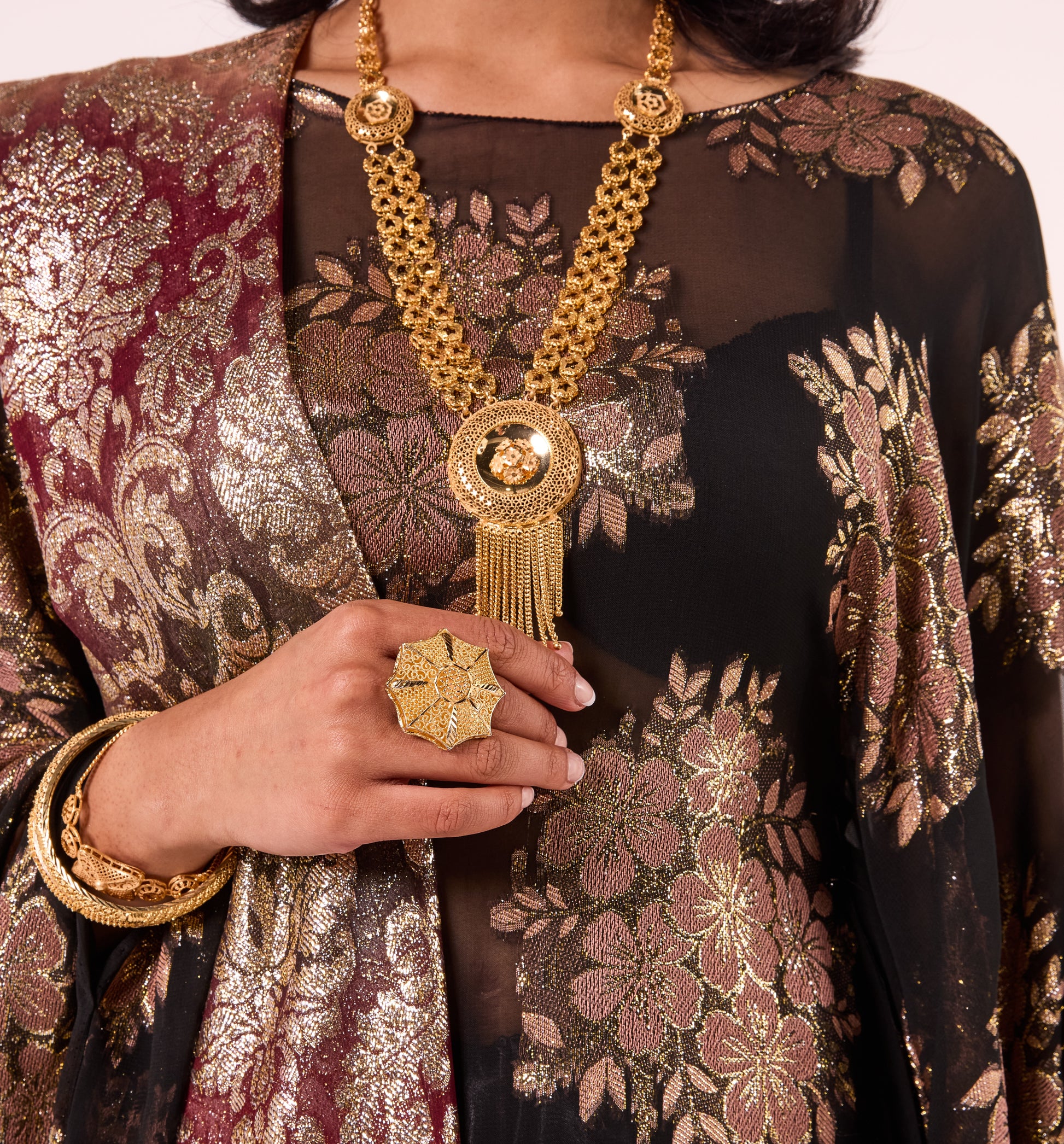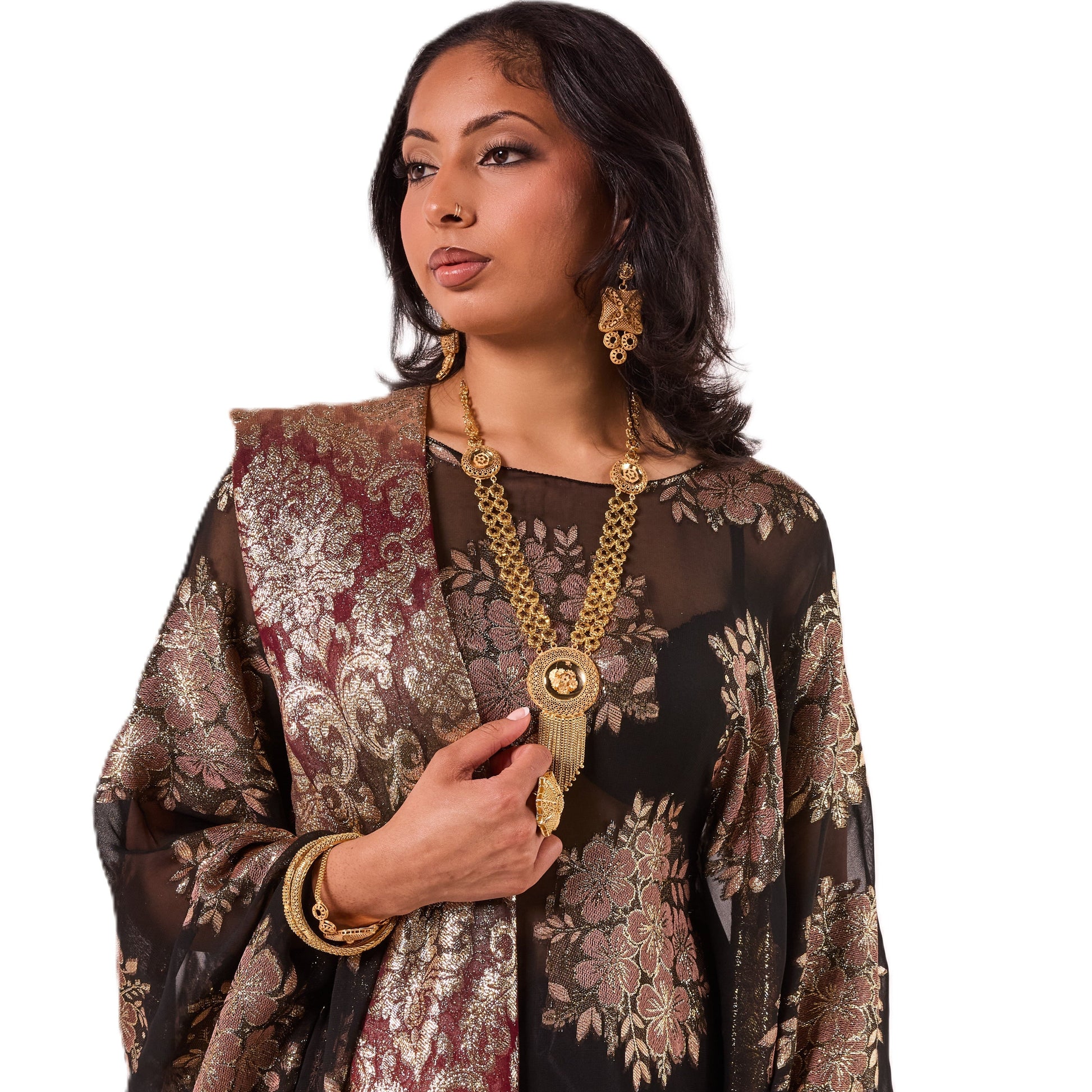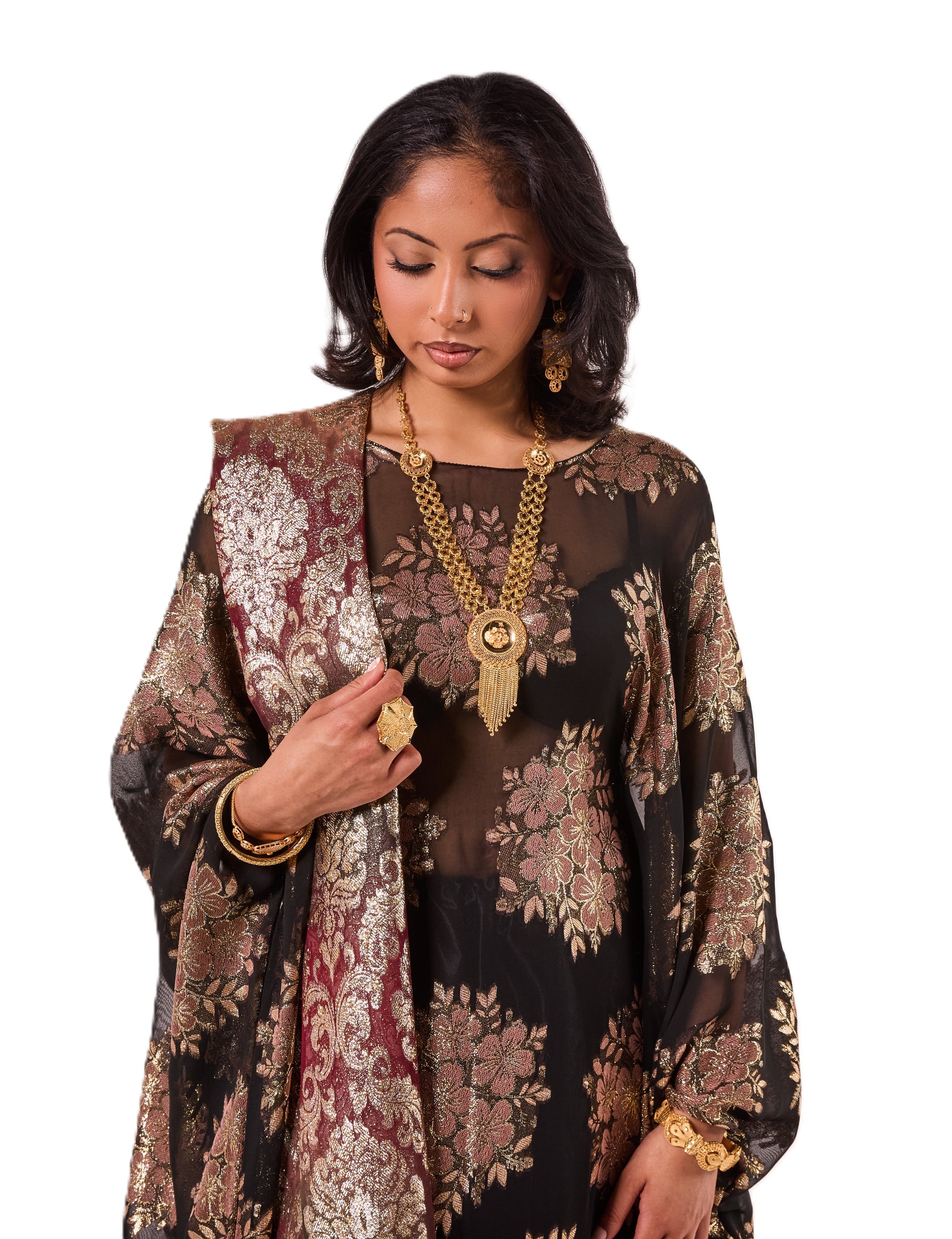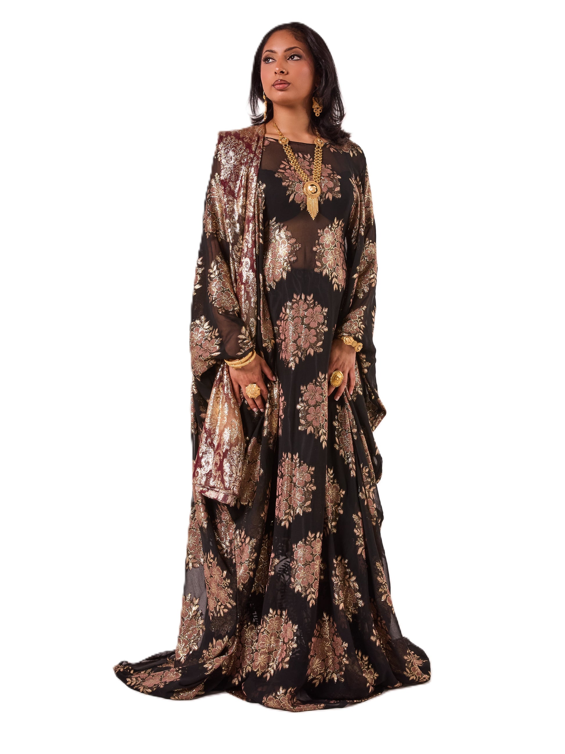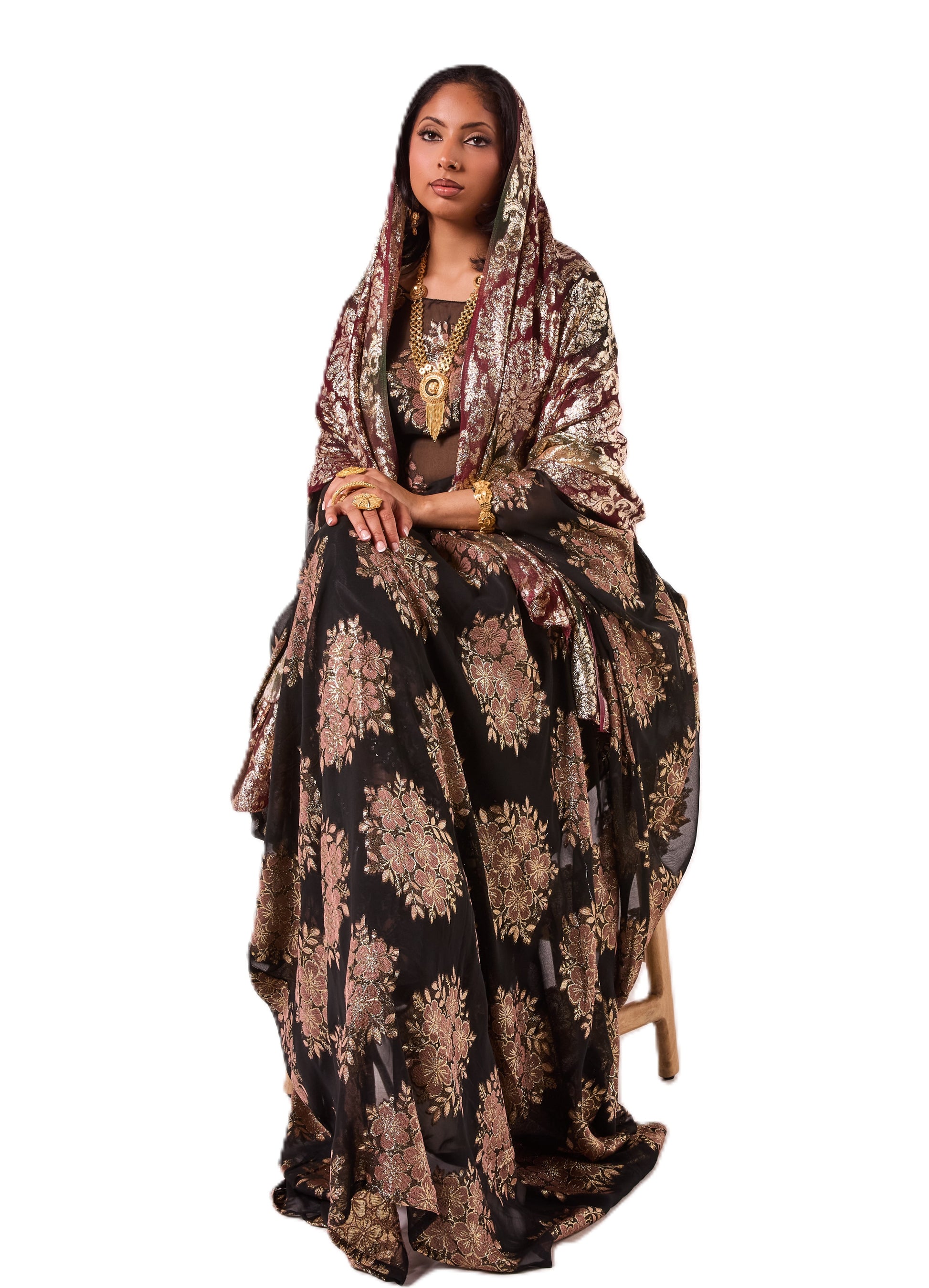 This Dirac features a regal black fabric with elegant gold floral detailing for a timeless, regal look. It comes with a rich maroon and gold scarf that drapes beautifully.