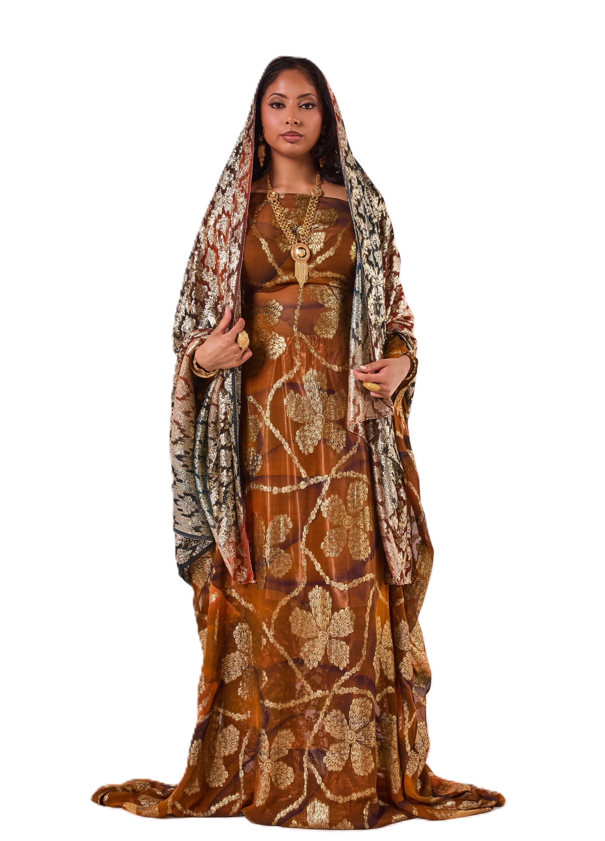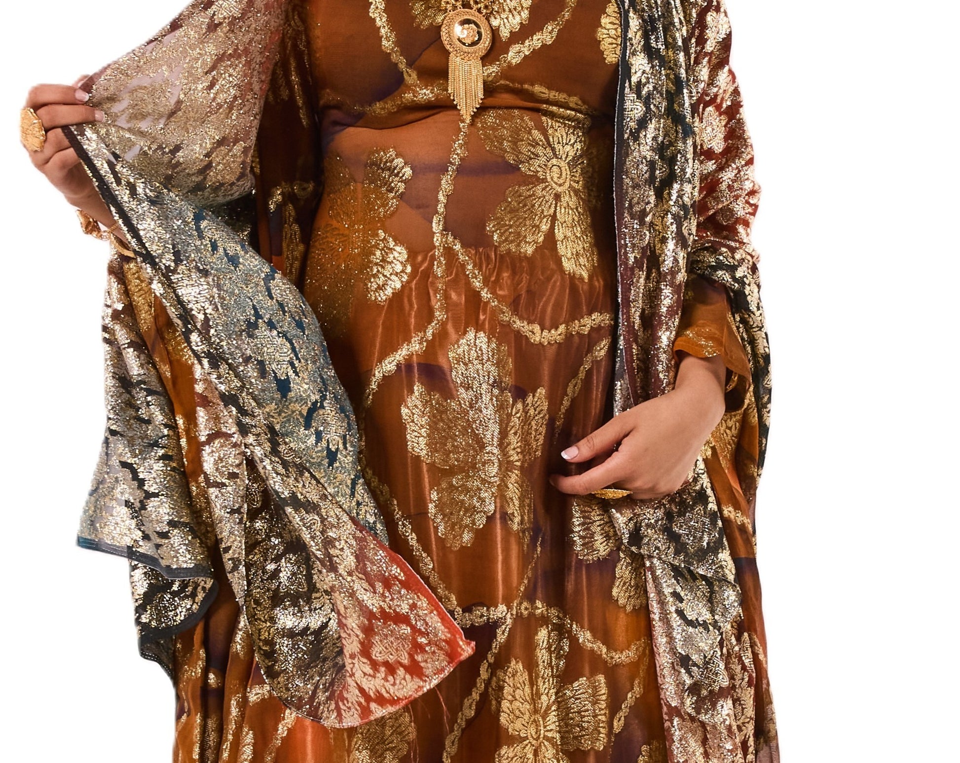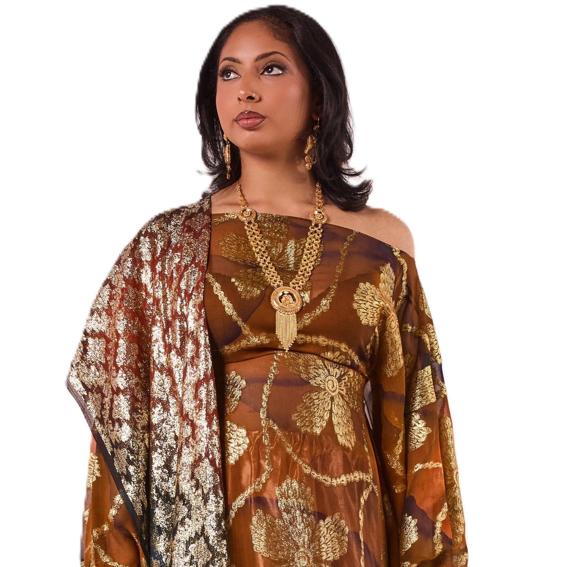 This Dirac features a warm bronze-brown base with intricate gold floral detailing for a rich, elegant look. It is paired with a patterned maroon and gold scarf that adds a bold finishing touch.