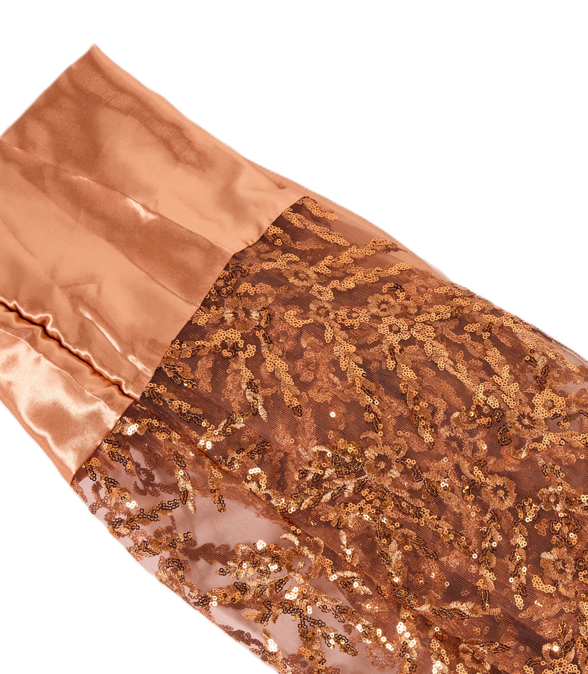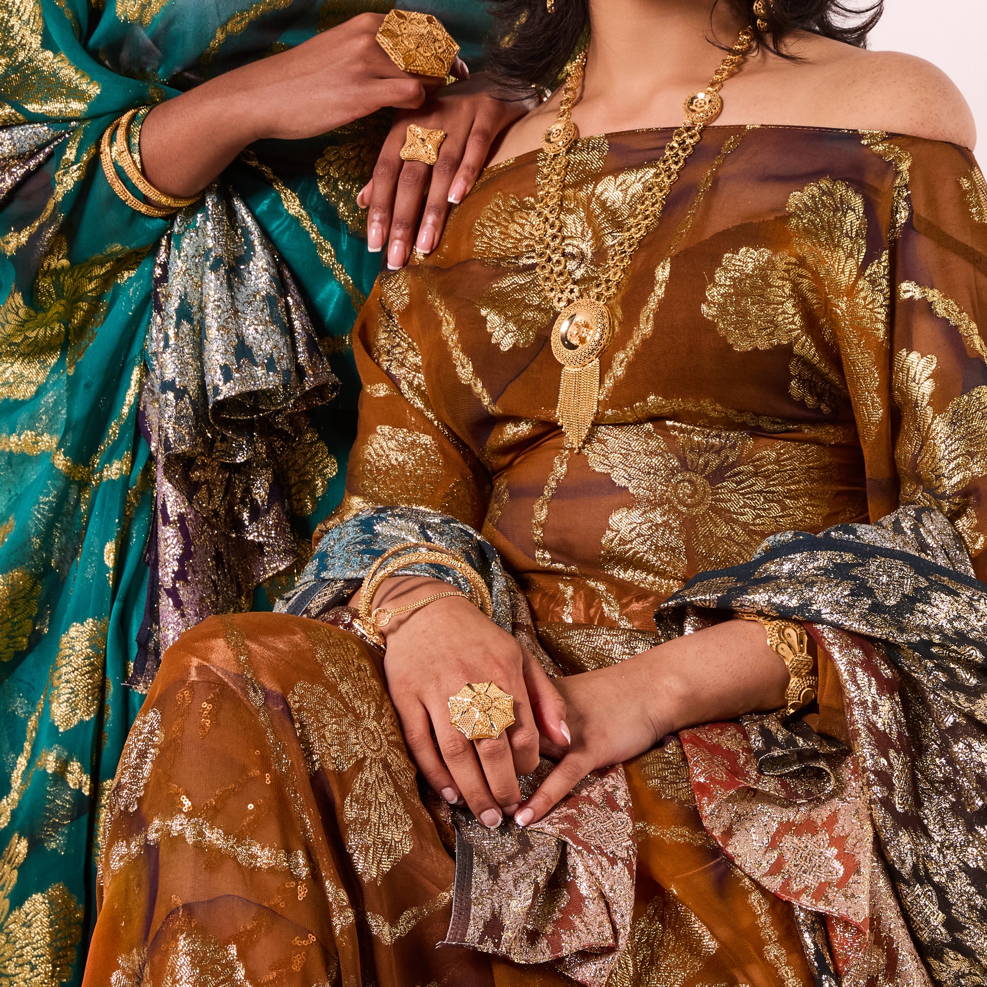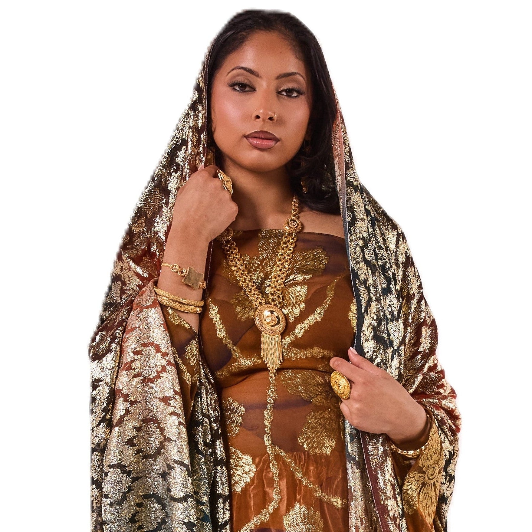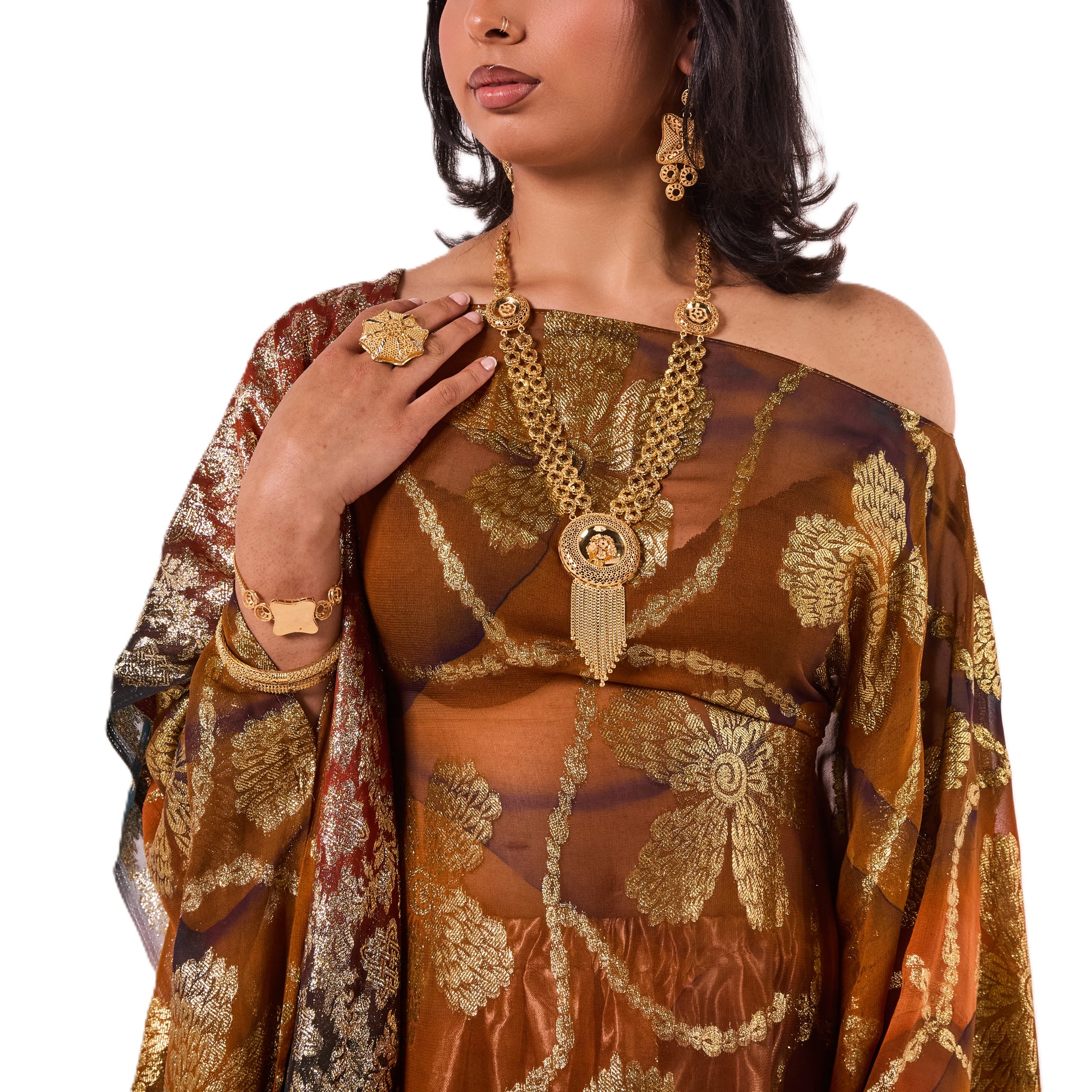 This Dirac features a warm bronze-brown base with intricate gold floral detailing for a rich, elegant look. It is paired with a patterned maroon and gold scarf that adds a bold finishing touch.