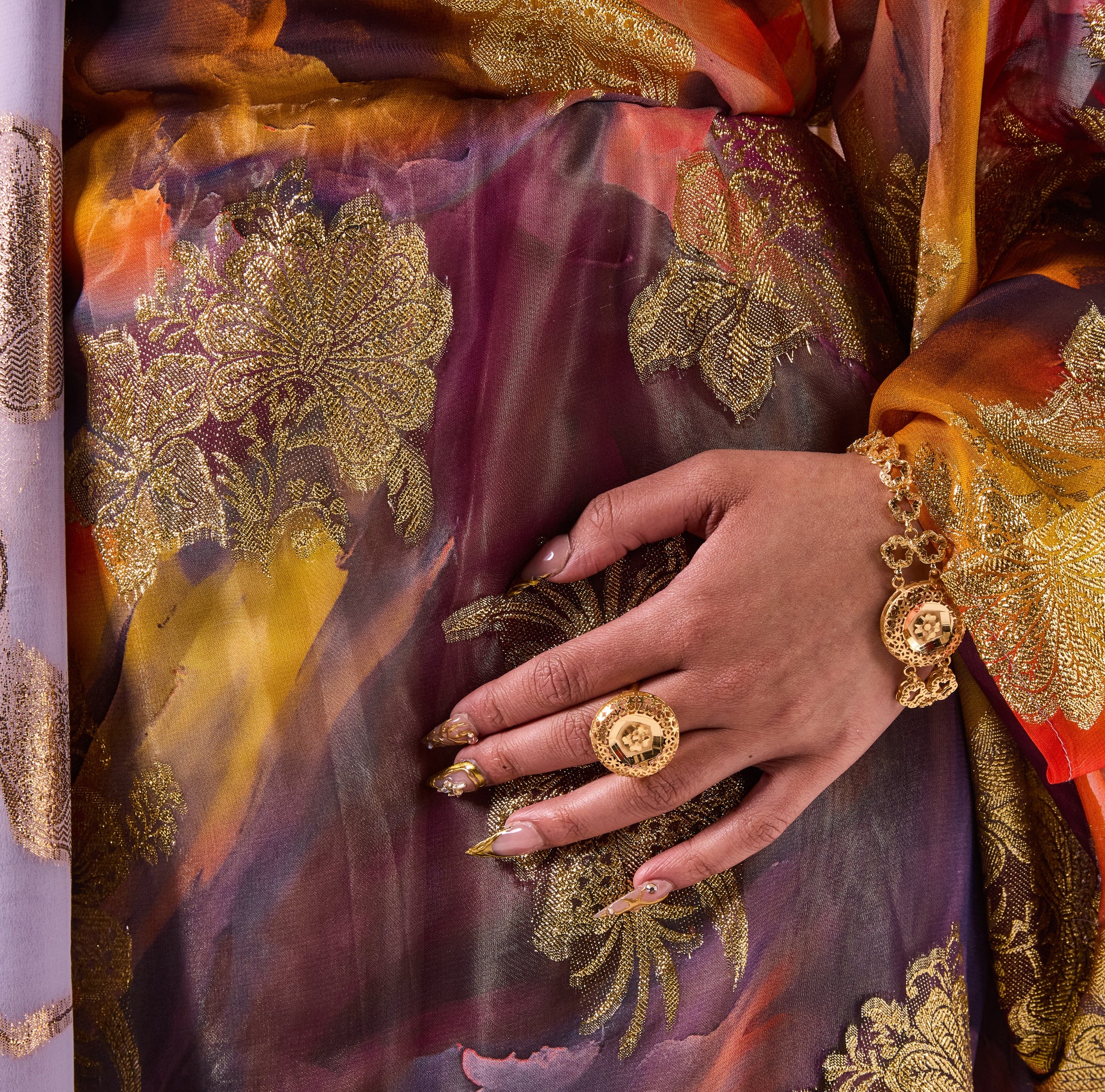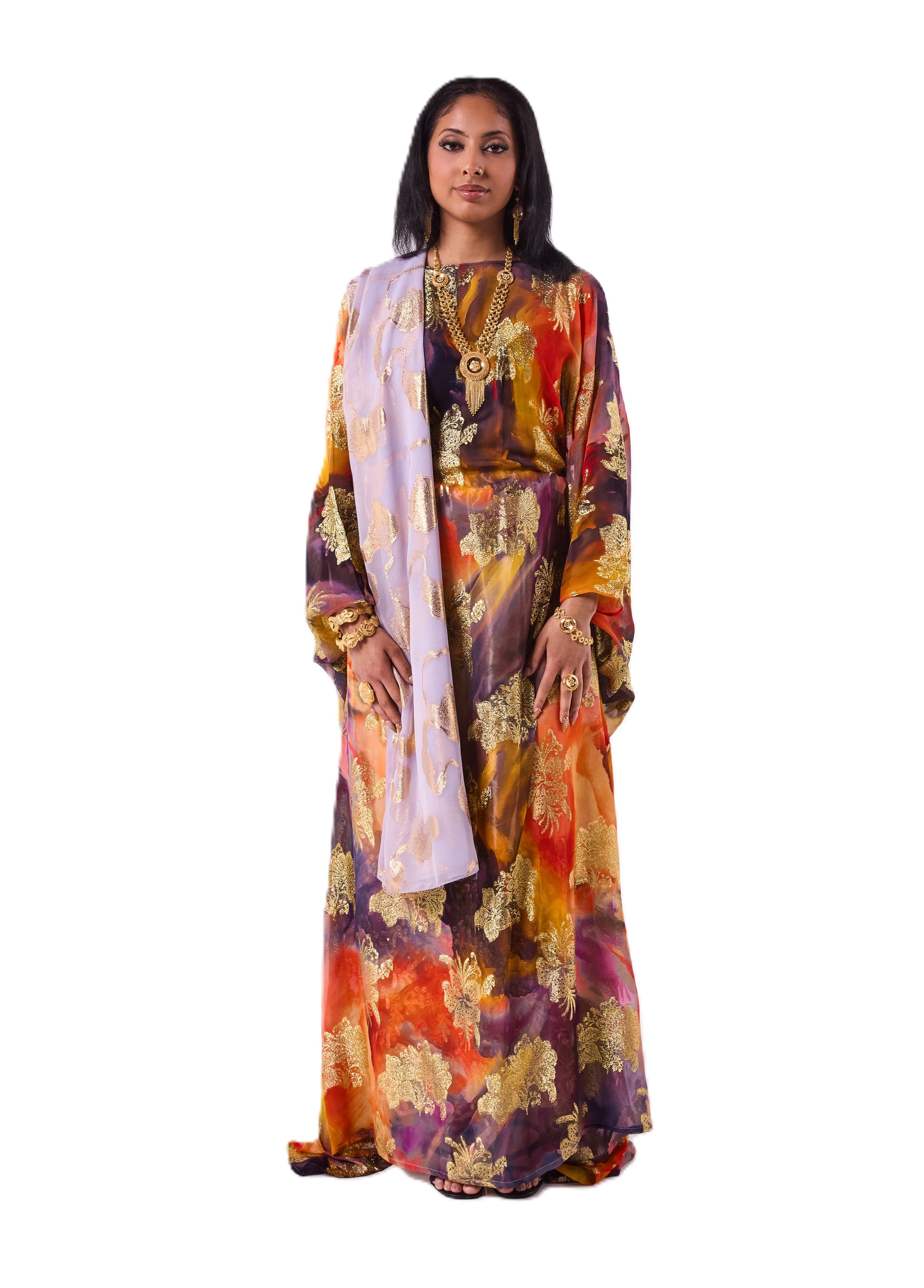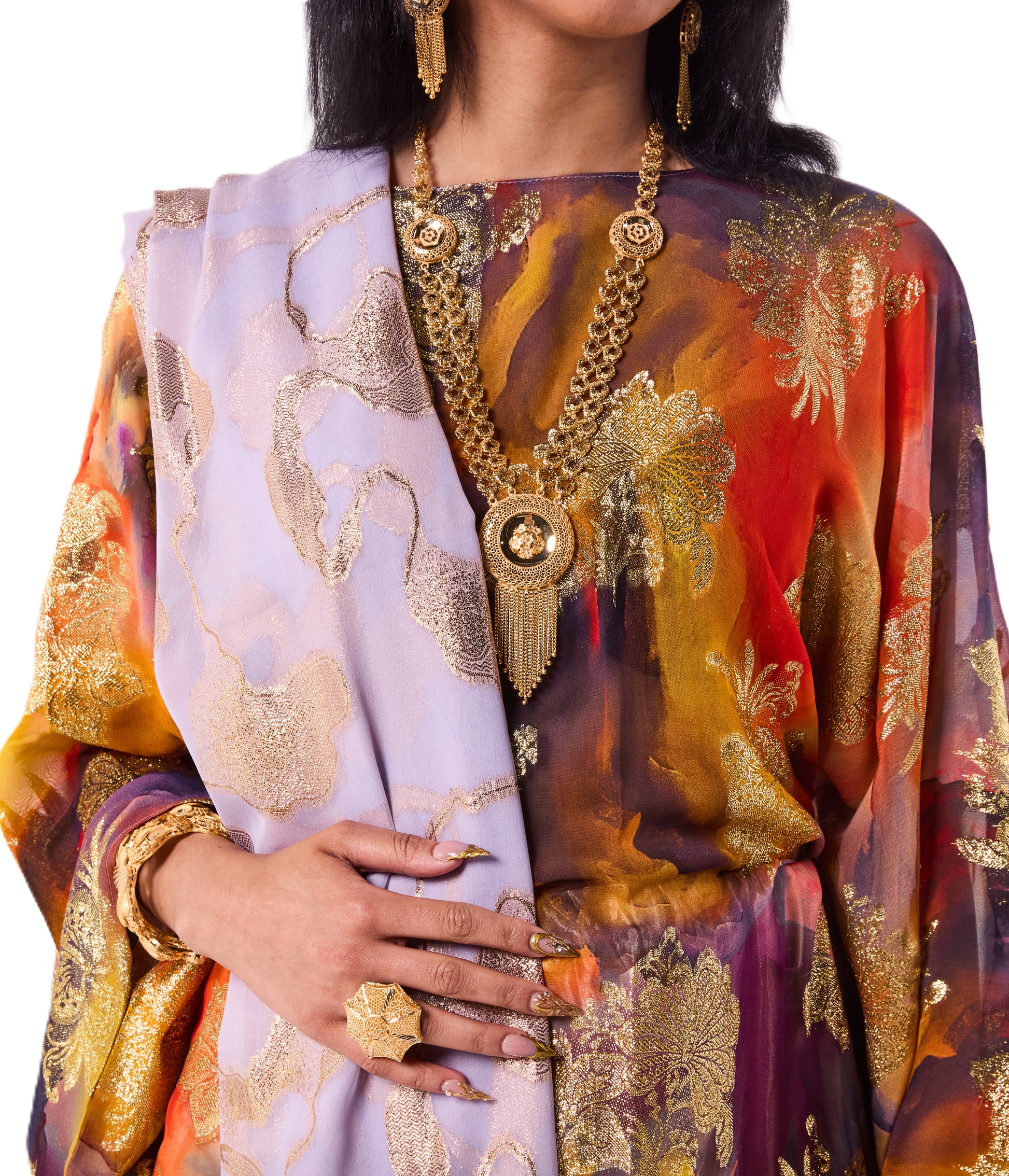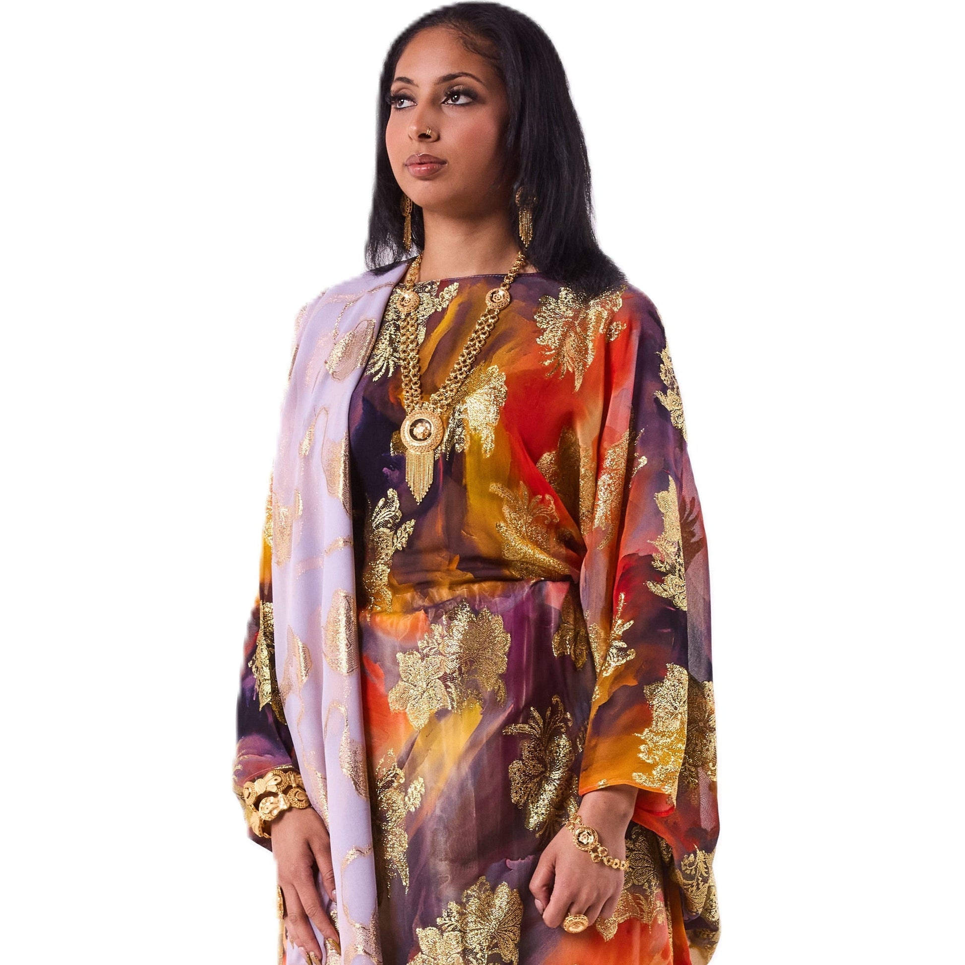 This Dirac features a warm blend of deep orange, plum, and sunset tones layered with rich gold floral detailing. Paired with a soft lilac scarf, it brings a striking and beautifully balanced finish.