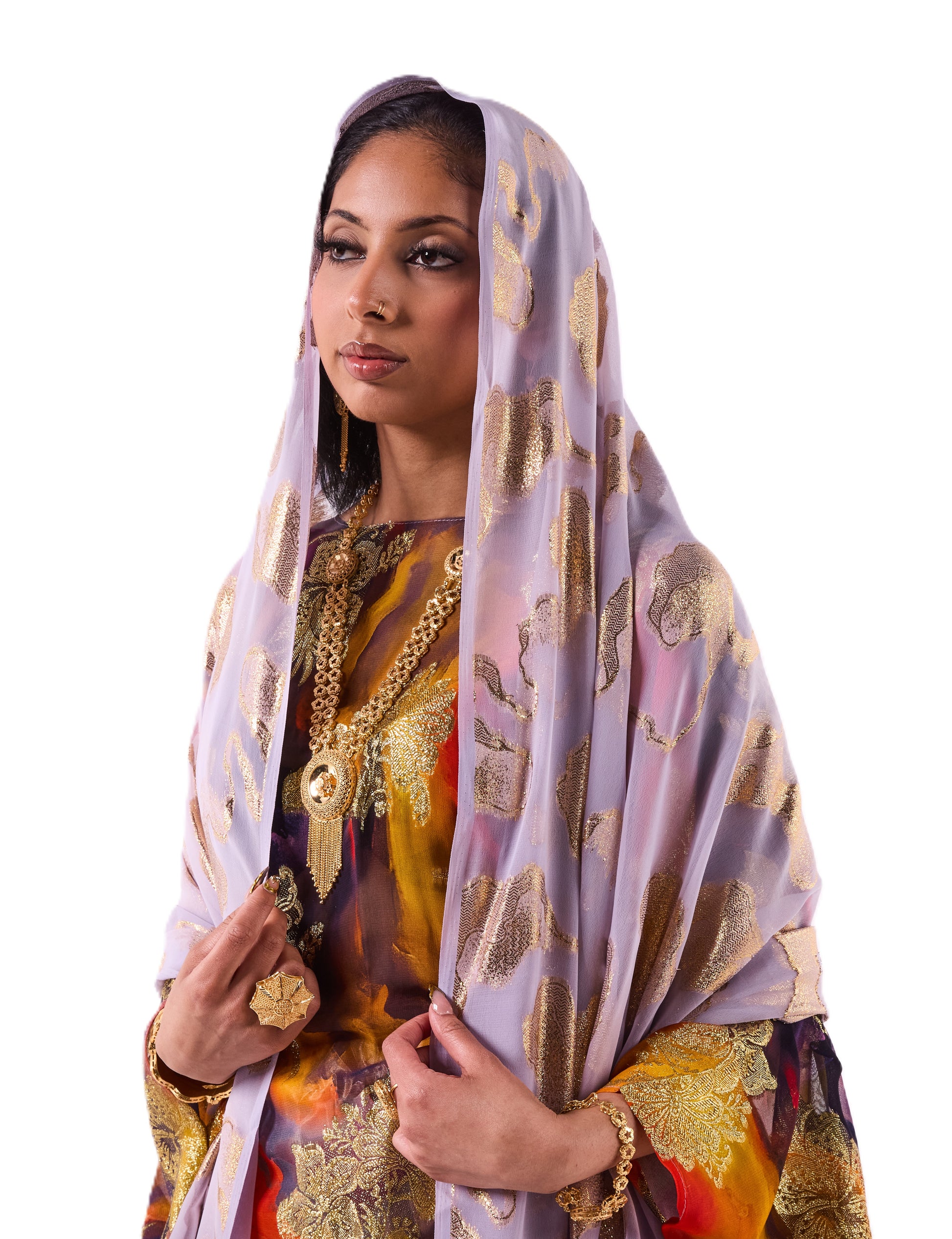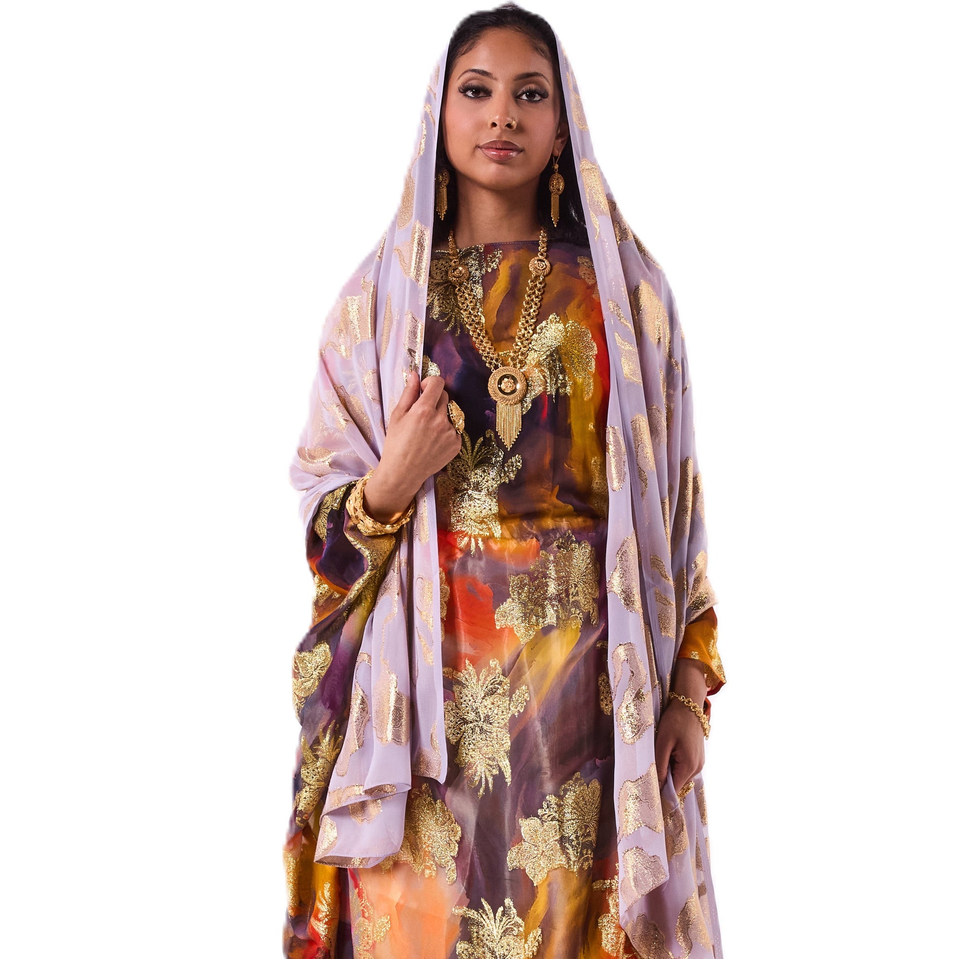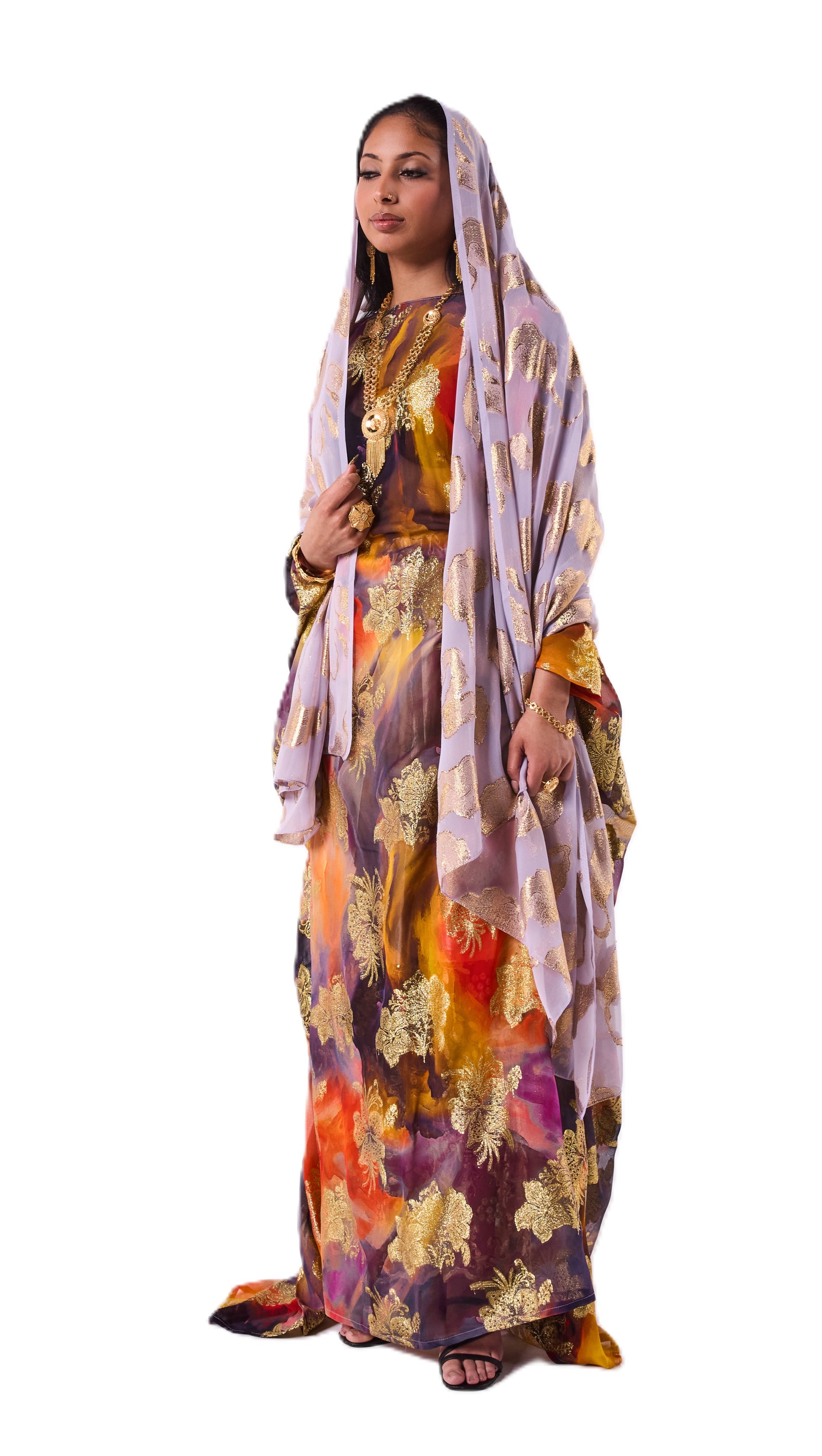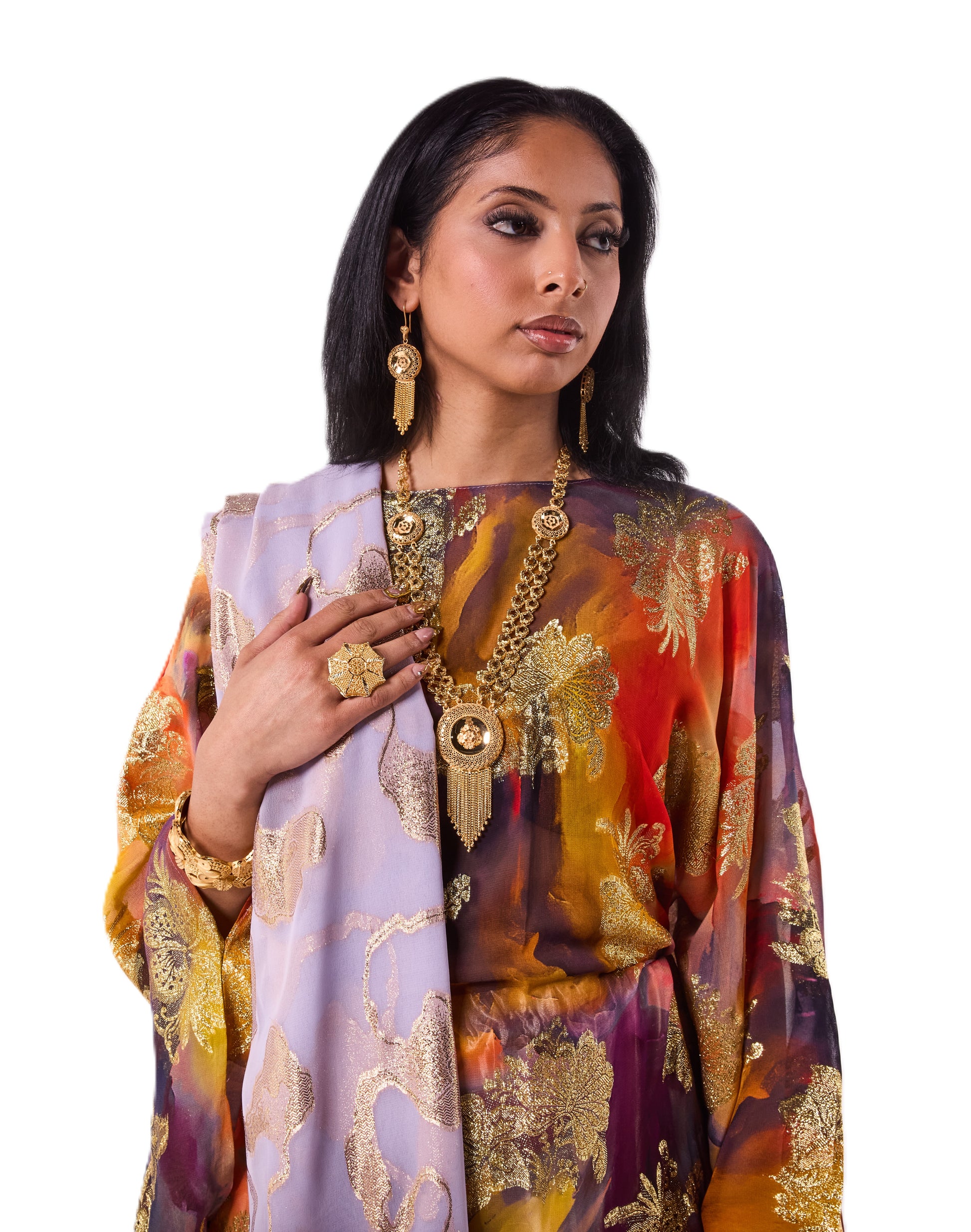 This Dirac features a warm blend of deep orange, plum, and sunset tones layered with rich gold floral detailing. Paired with a soft lilac scarf, it brings a striking and beautifully balanced finish.
