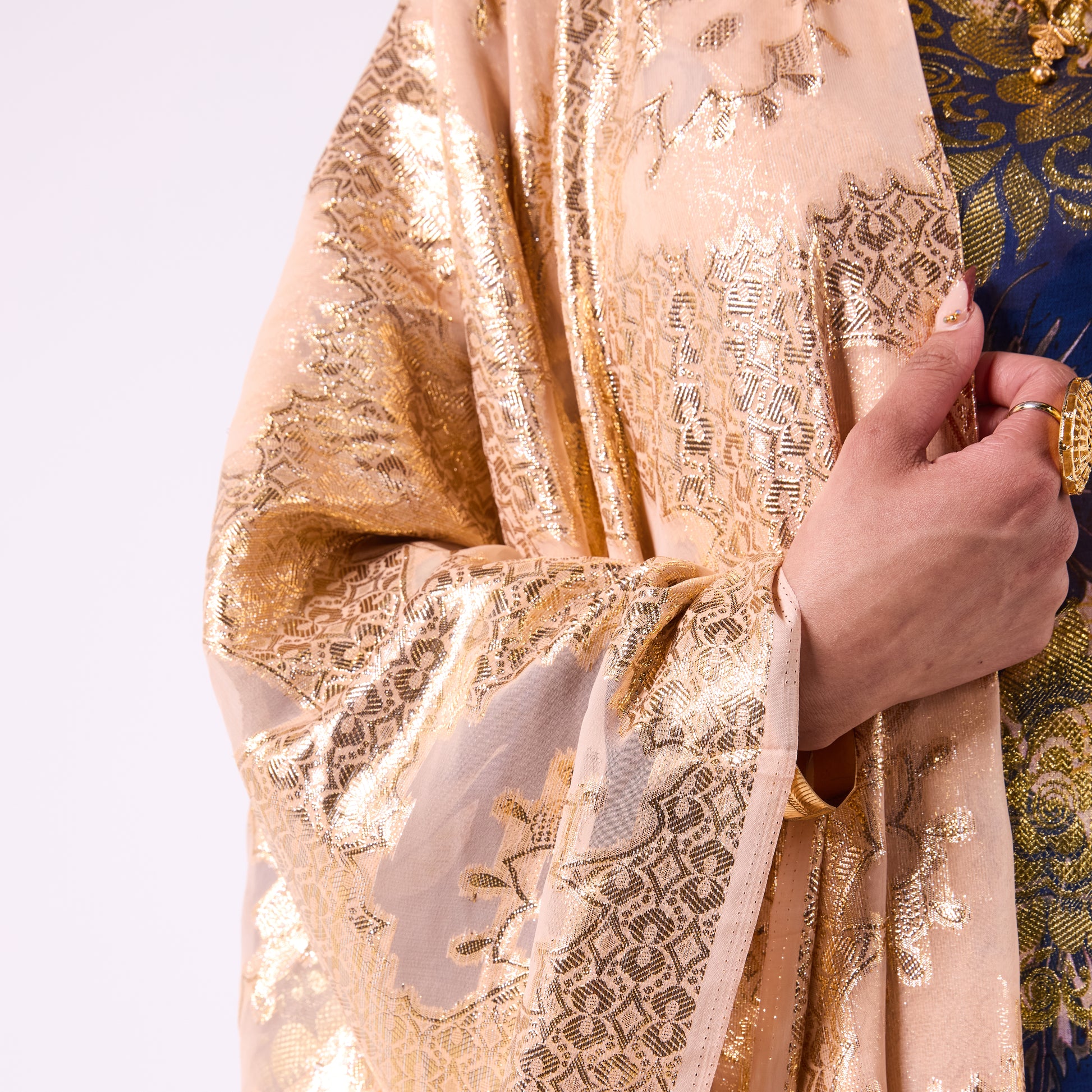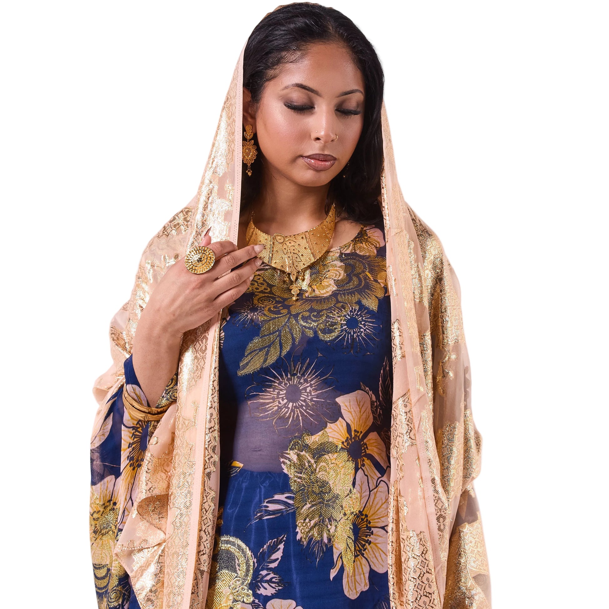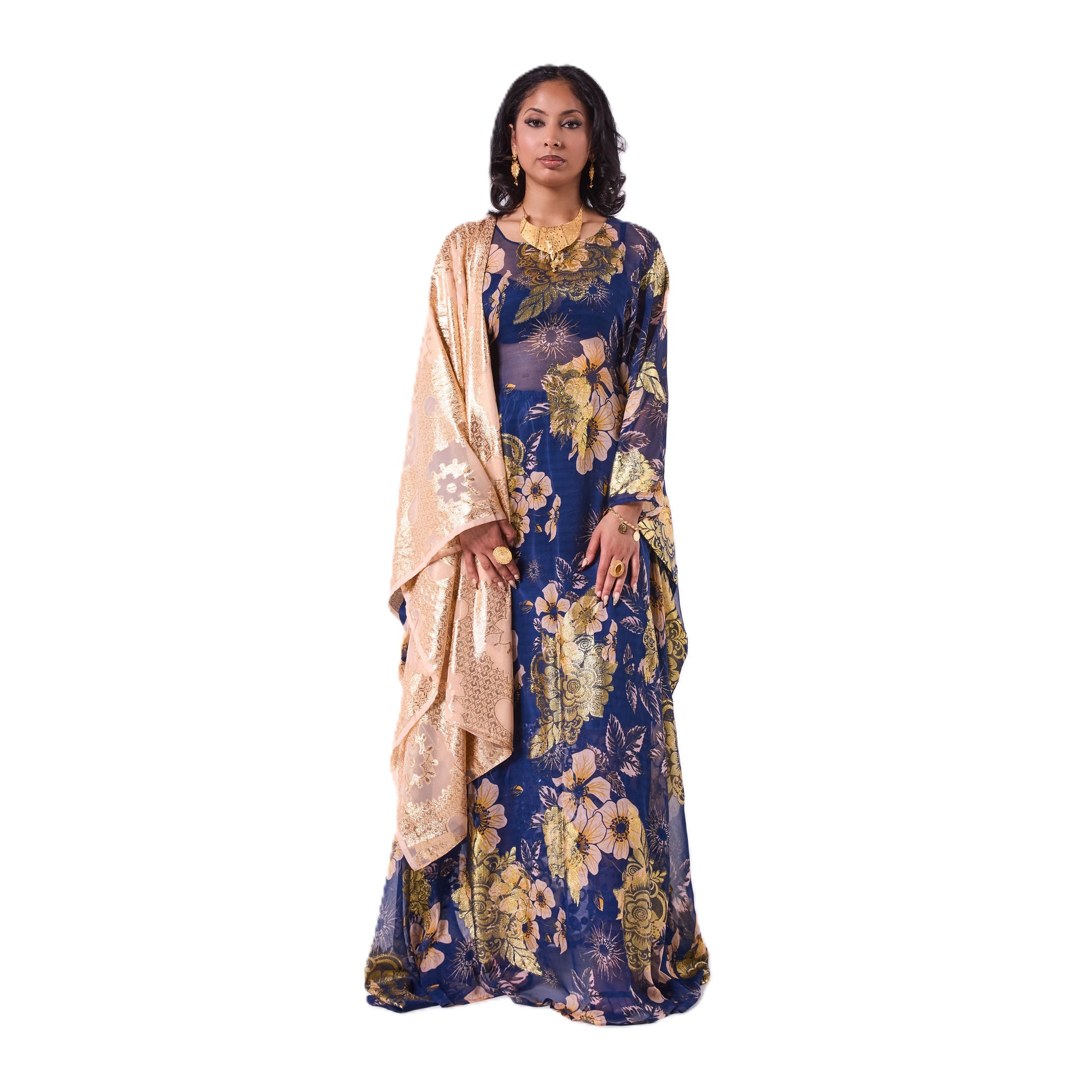This dirac features a deep navy base adorned with soft floral patterns and gold detailing, creating a rich and elegant contrast. Paired with a shimmering gold scarf, it drapes effortlessly for a bold yet graceful statement look.