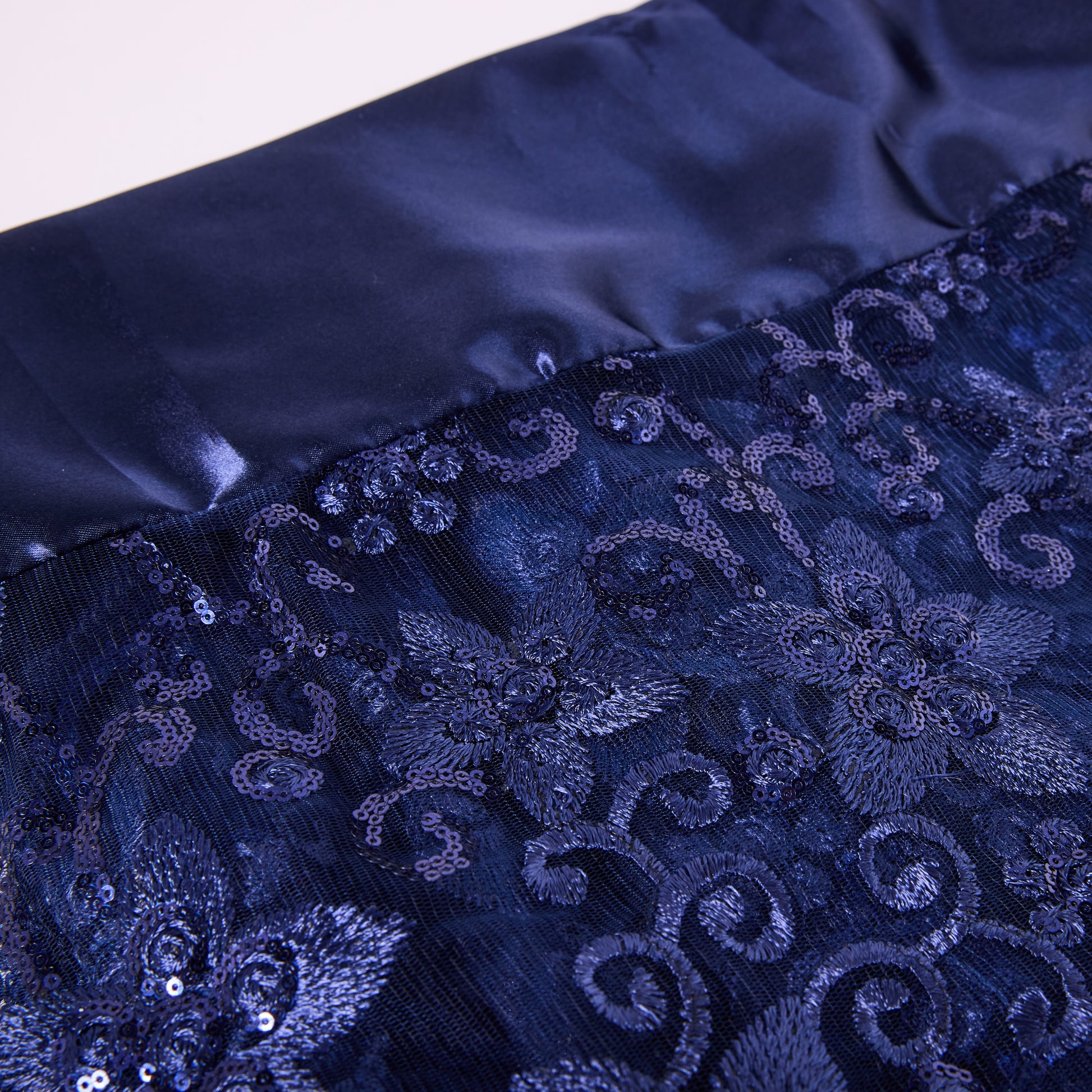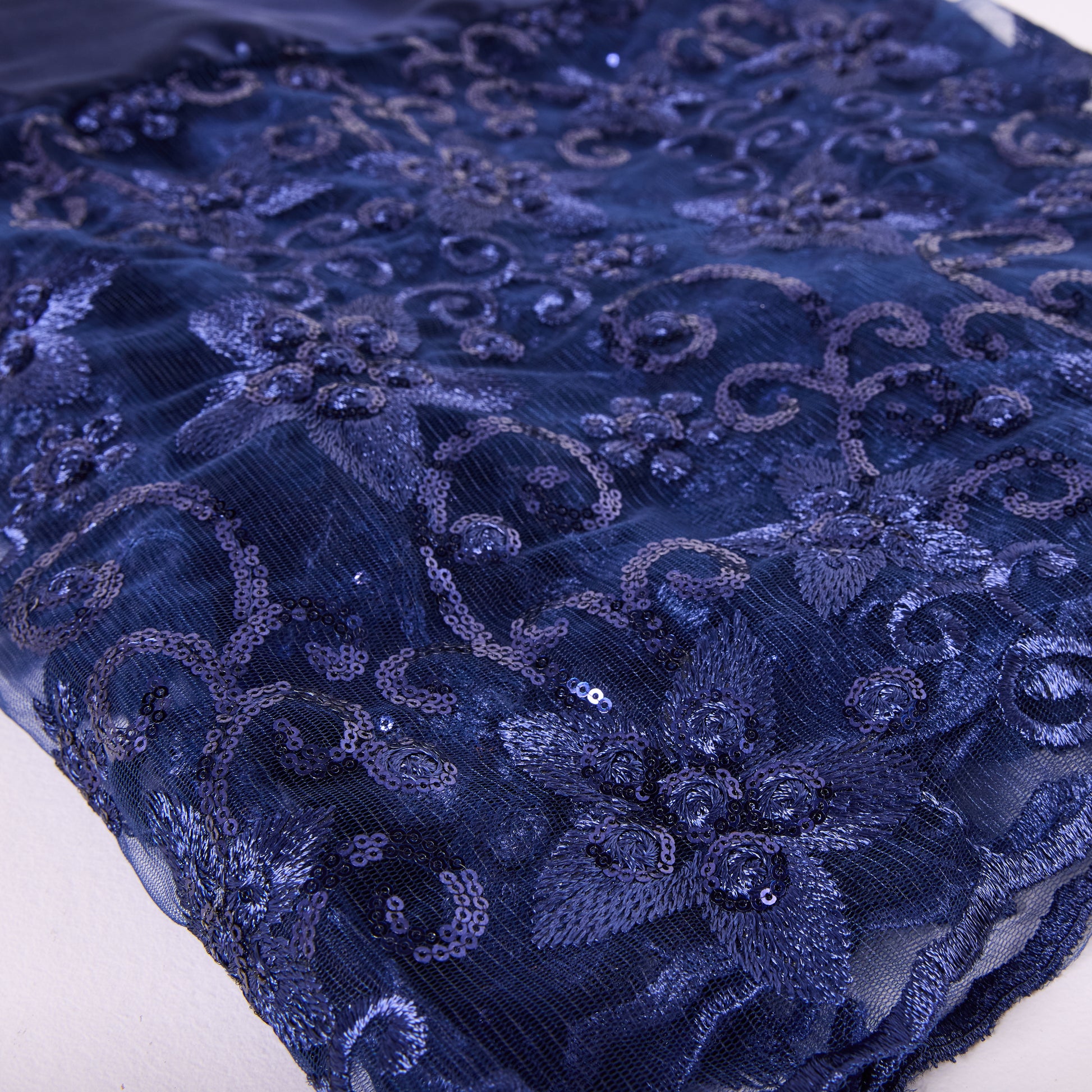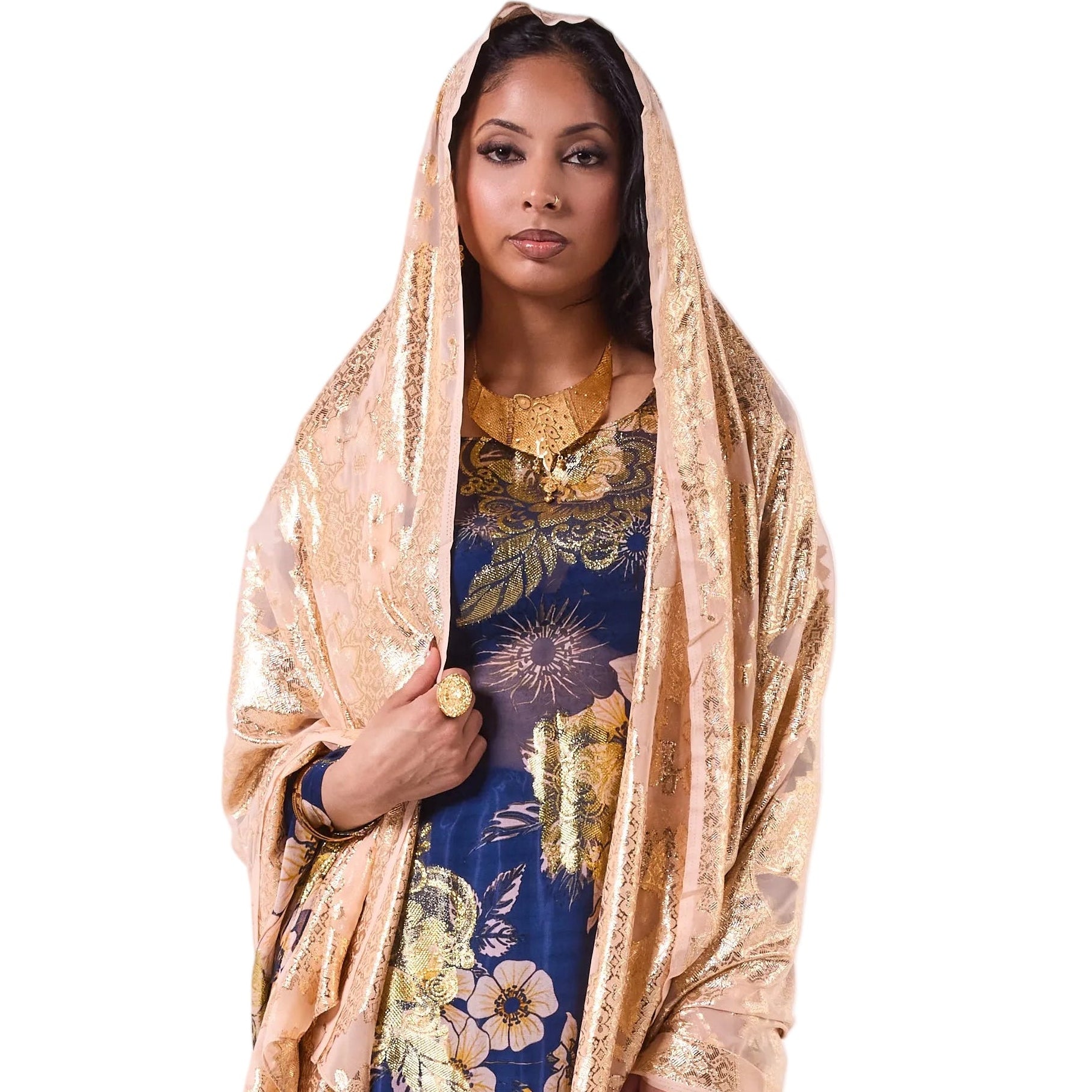 This dirac features a deep navy base adorned with soft floral patterns and gold detailing, creating a rich and elegant contrast. Paired with a shimmering gold scarf, it drapes effortlessly for a bold yet graceful statement look.