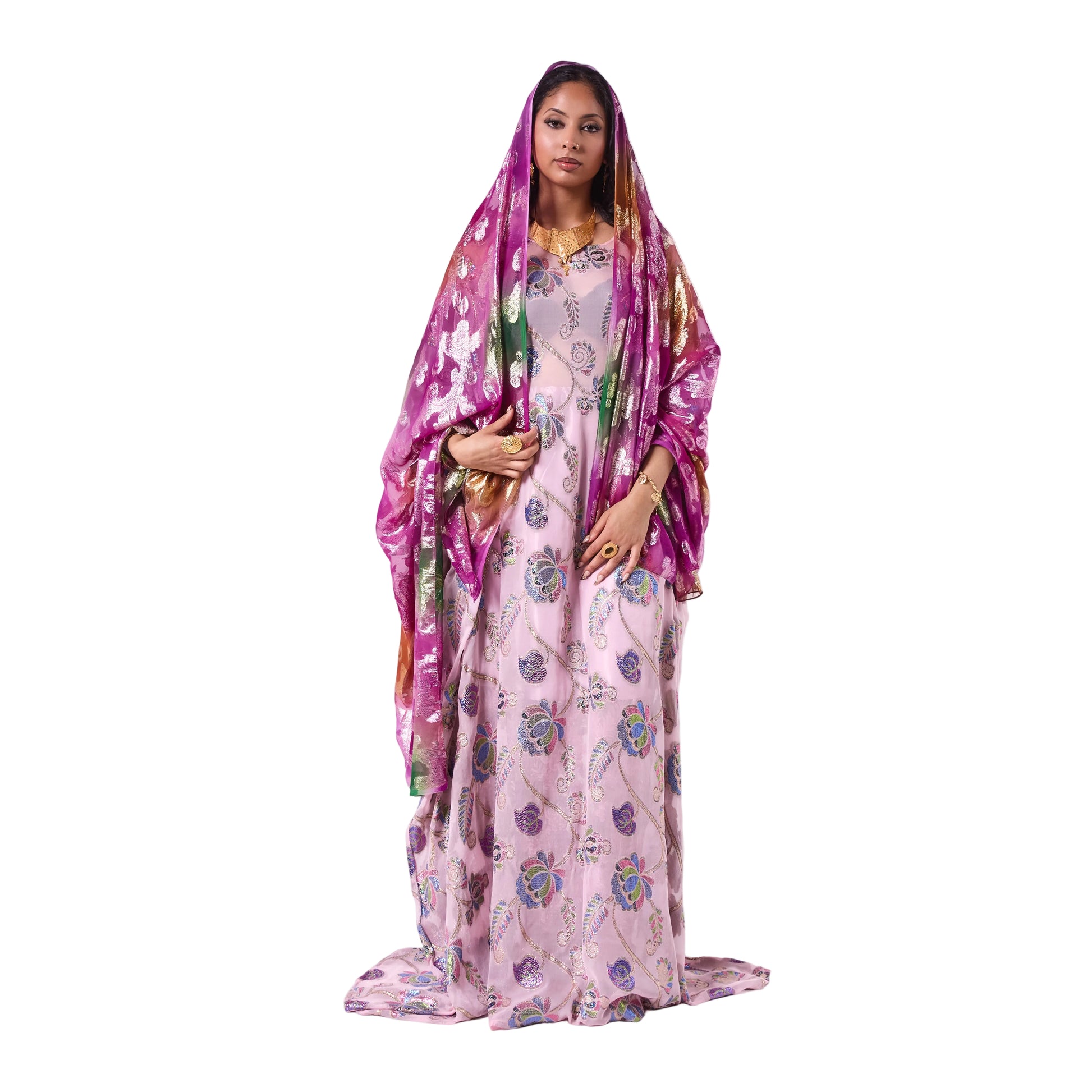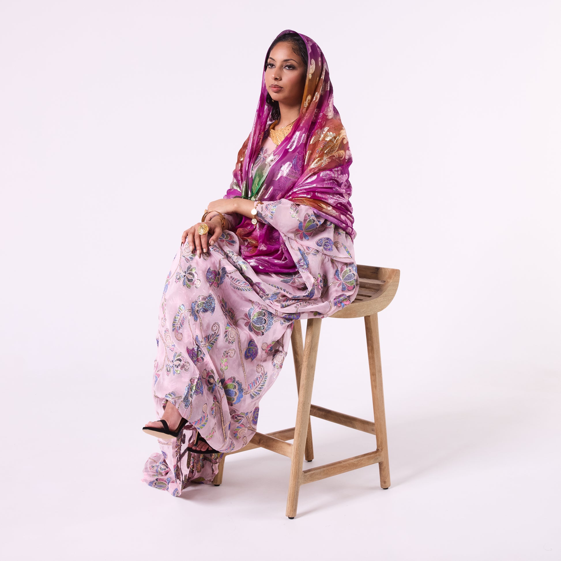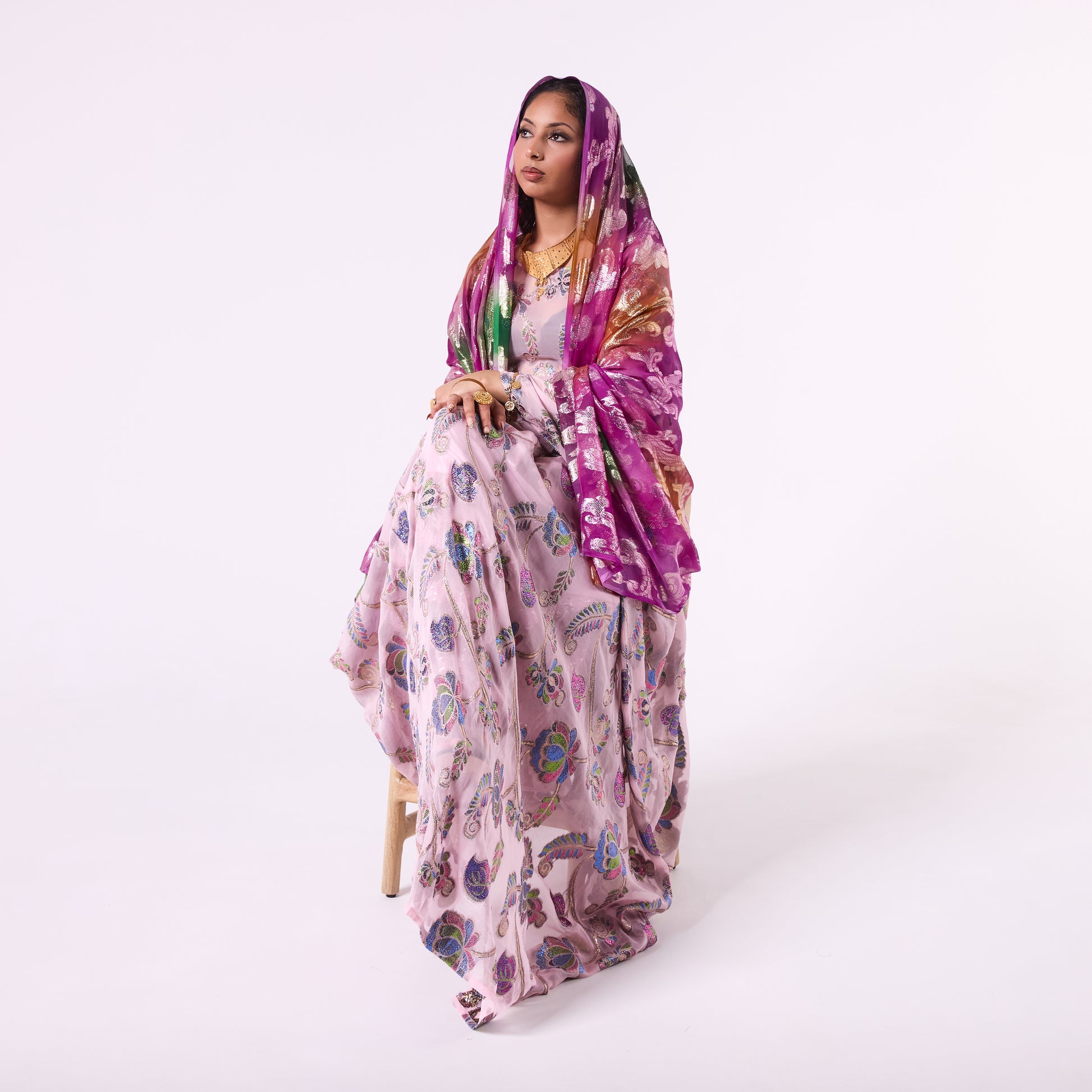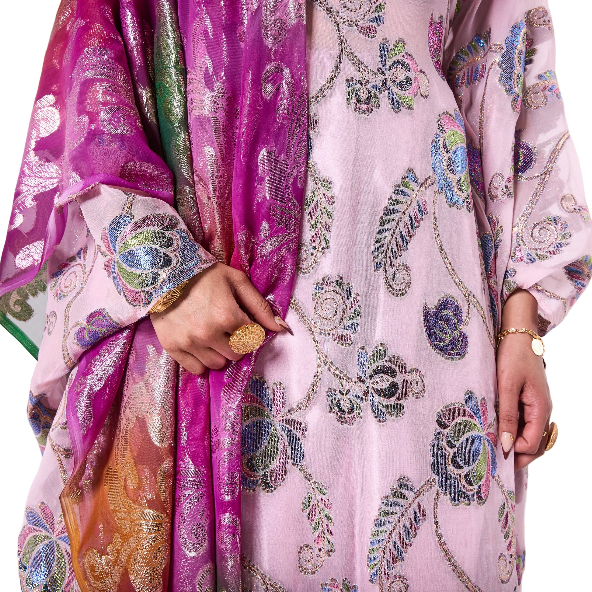 This dirac features a soft blush base with intricate multicolour floral detailing and subtle shimmer throughout. Paired with a rich purple scarf accented with gold and green tones, it drapes effortlessly for a statement yet elegant finish.