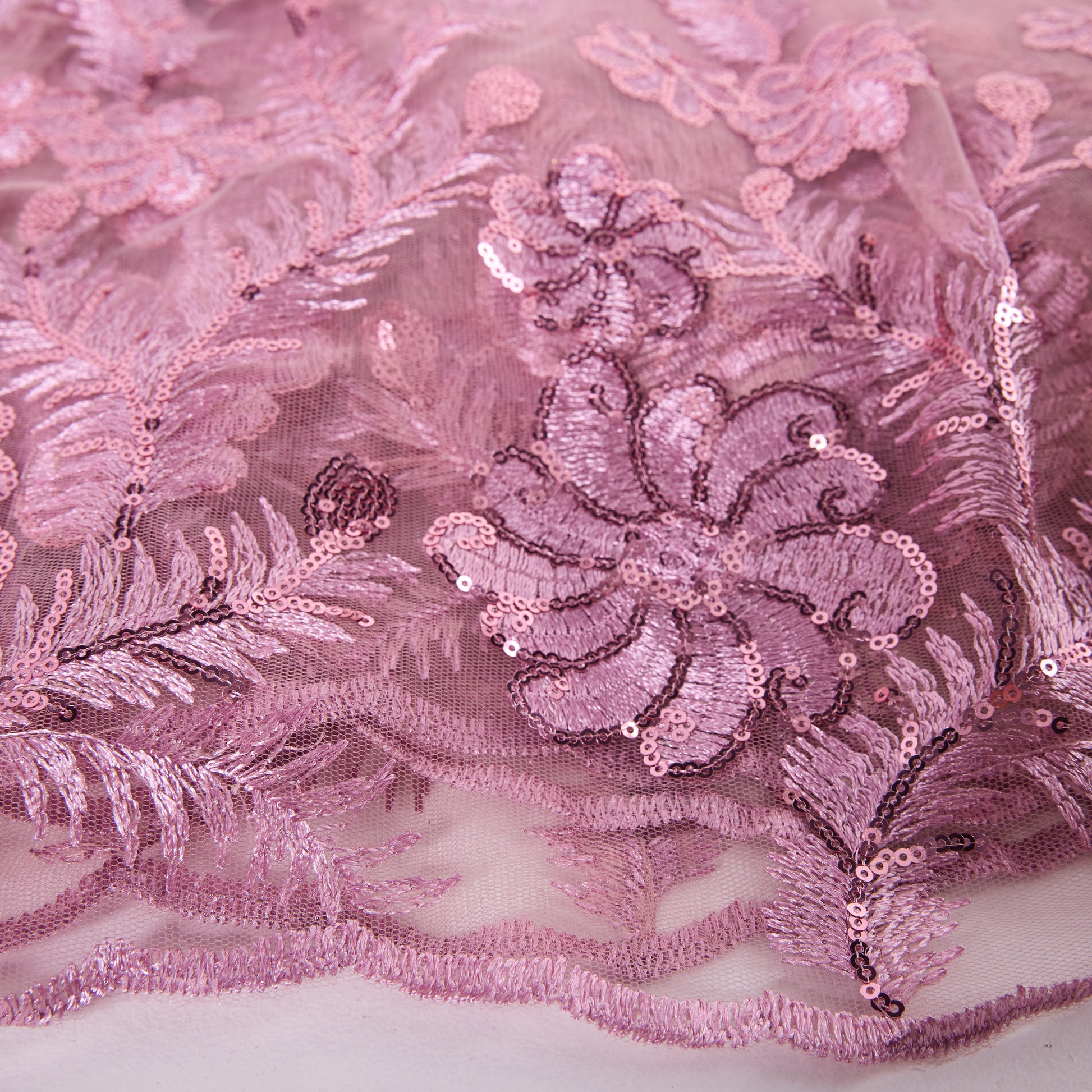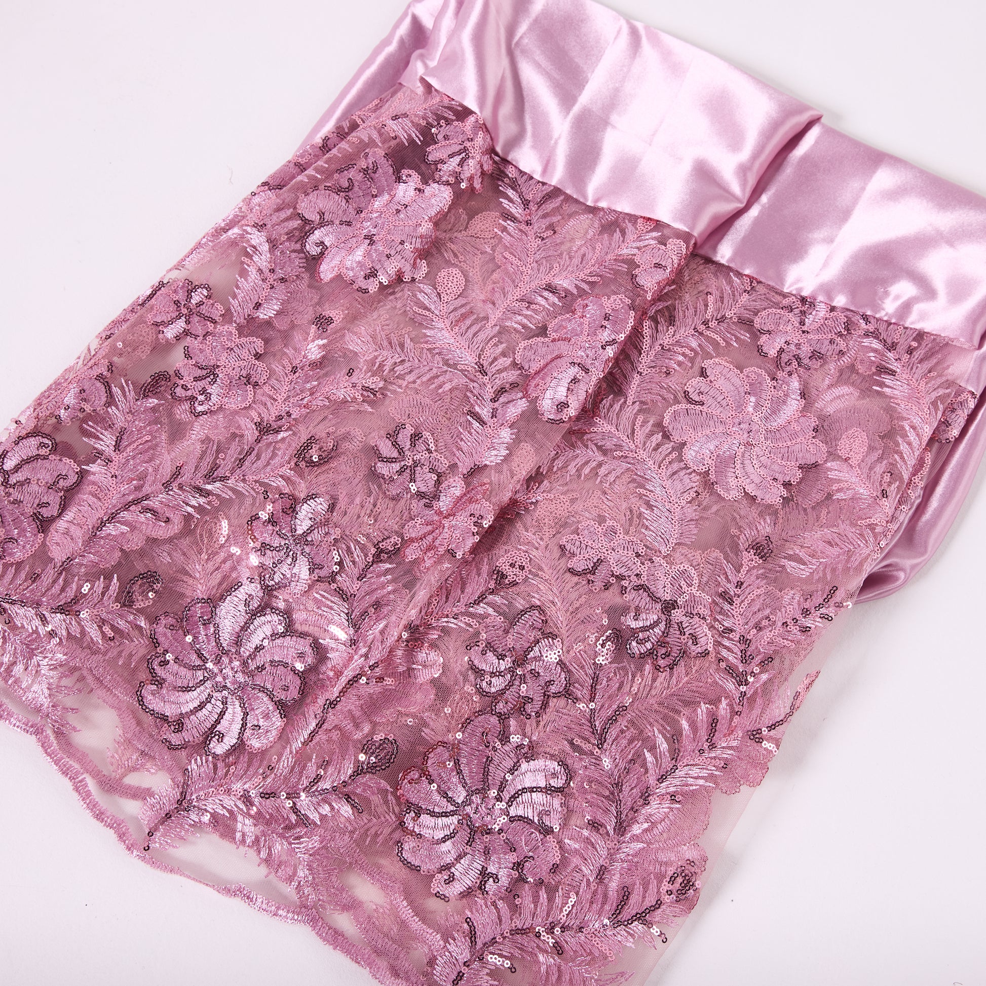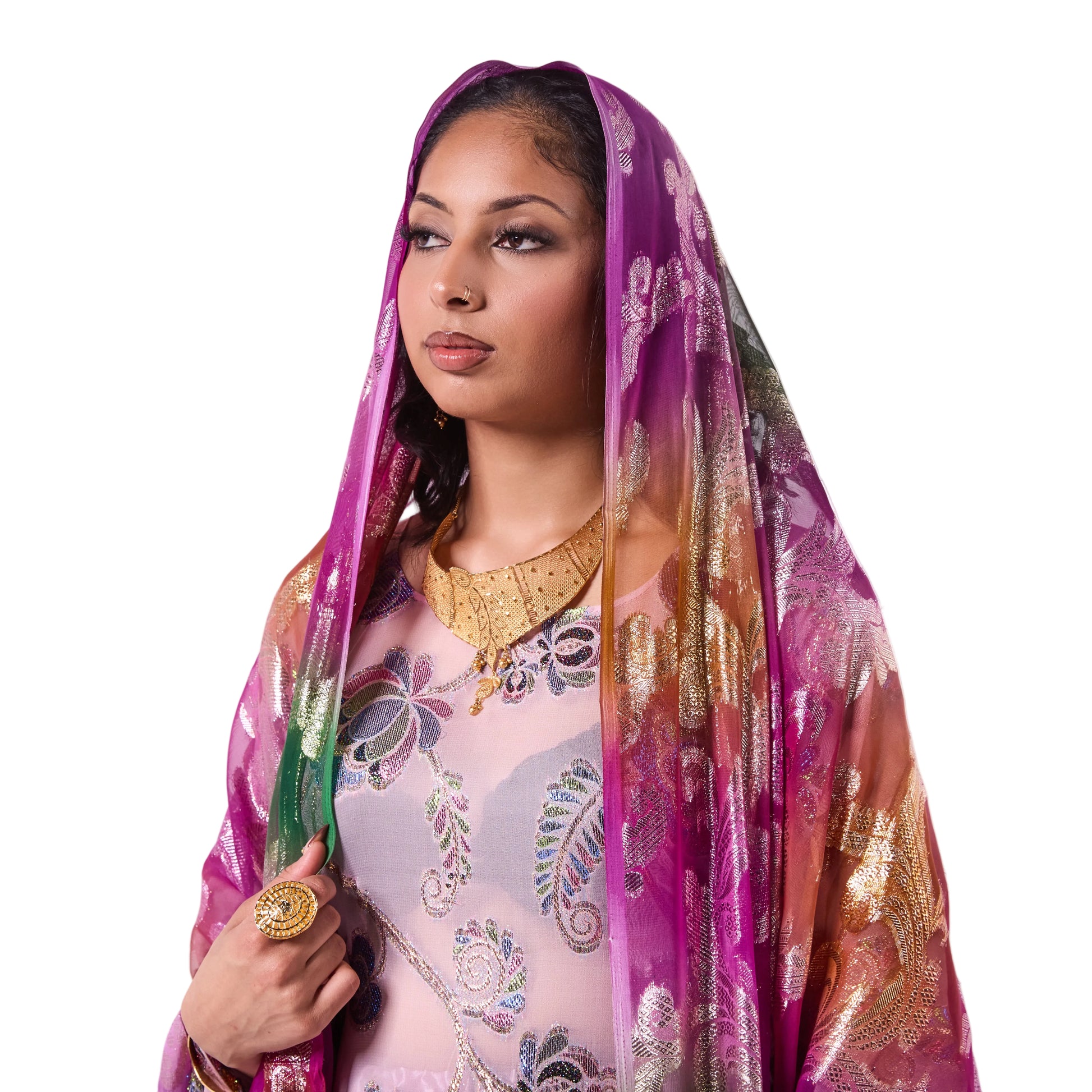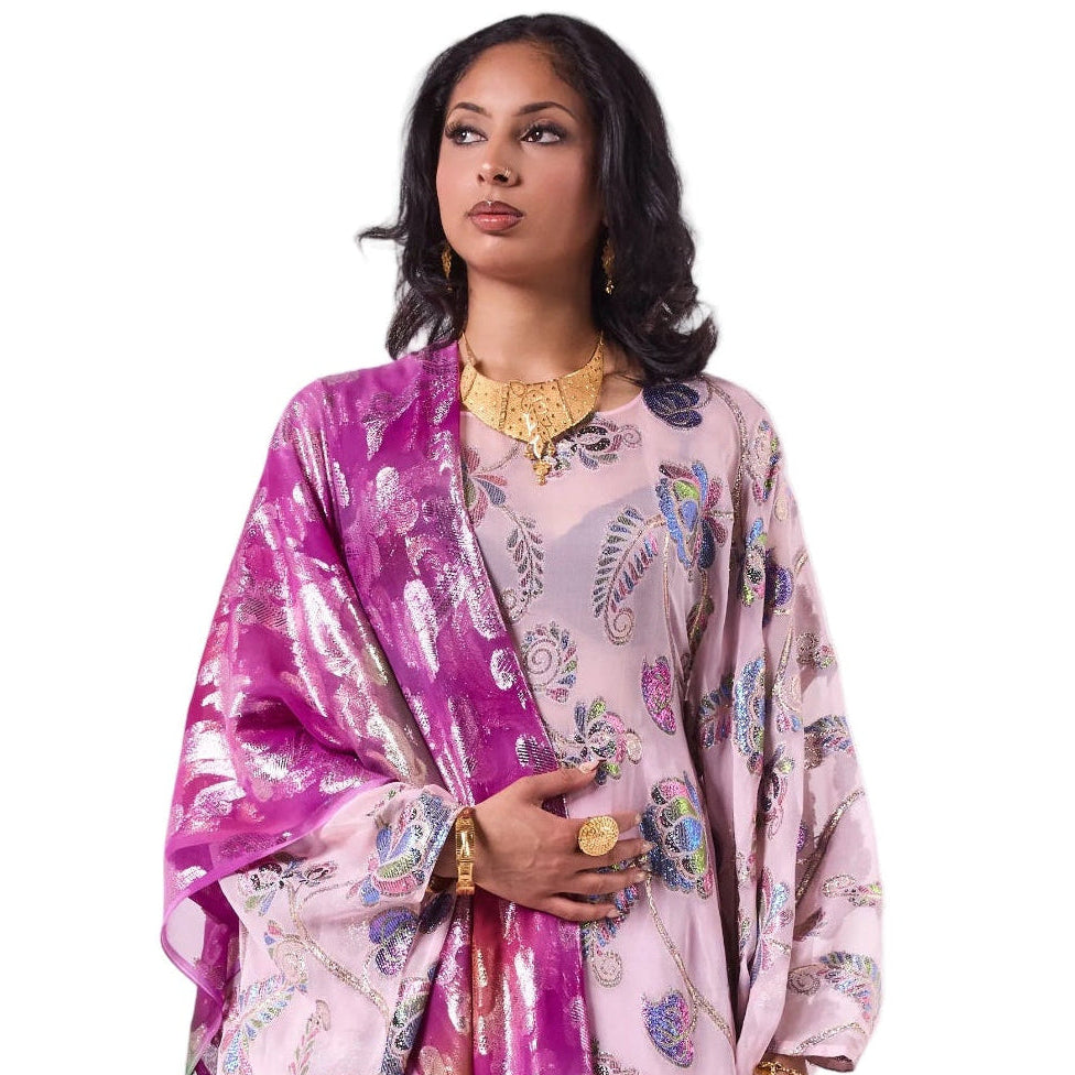 This dirac features a soft blush base with intricate multicolour floral detailing and subtle shimmer throughout. Paired with a rich purple scarf accented with gold and green tones, it drapes effortlessly for a statement yet elegant finish.