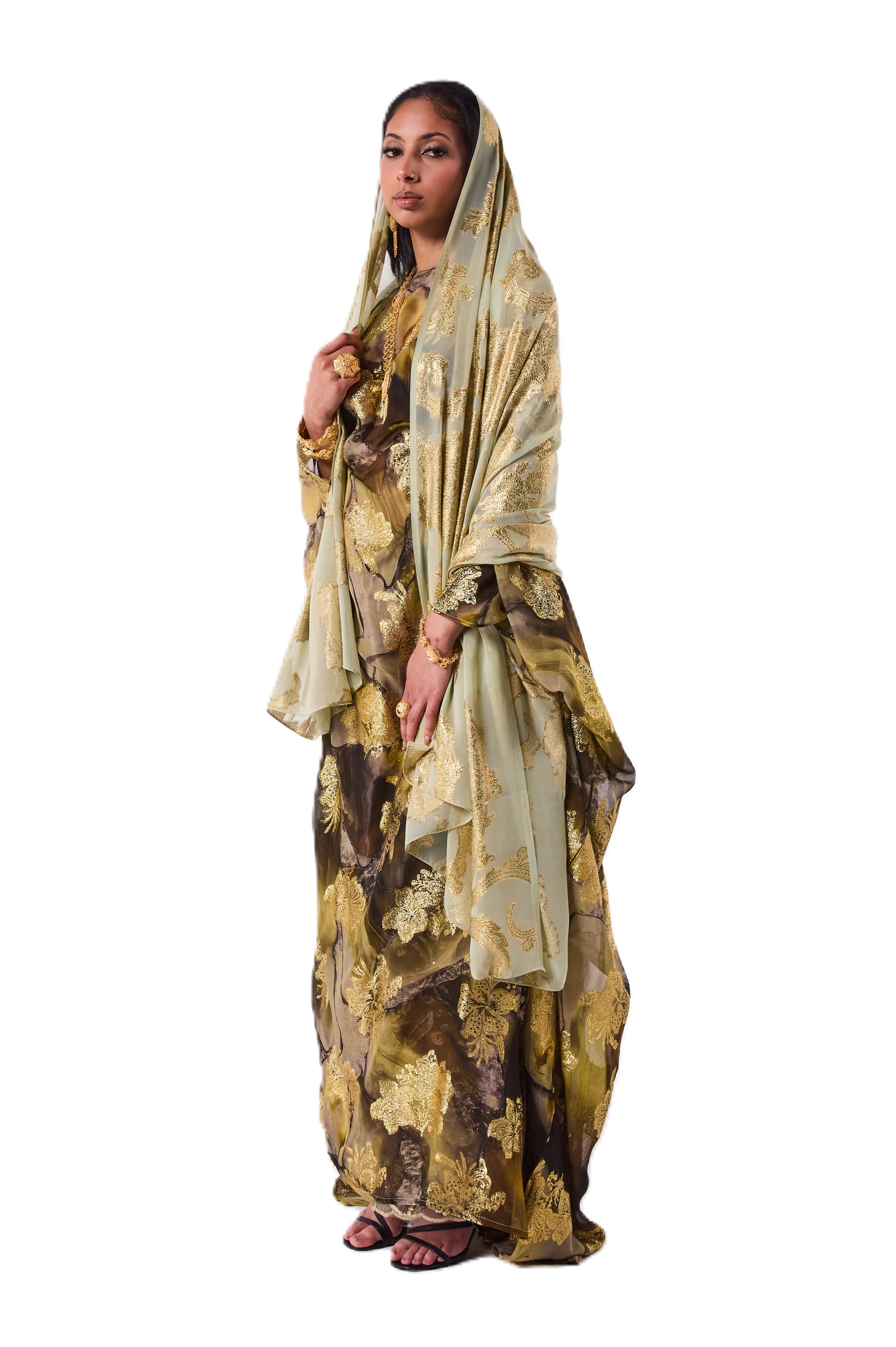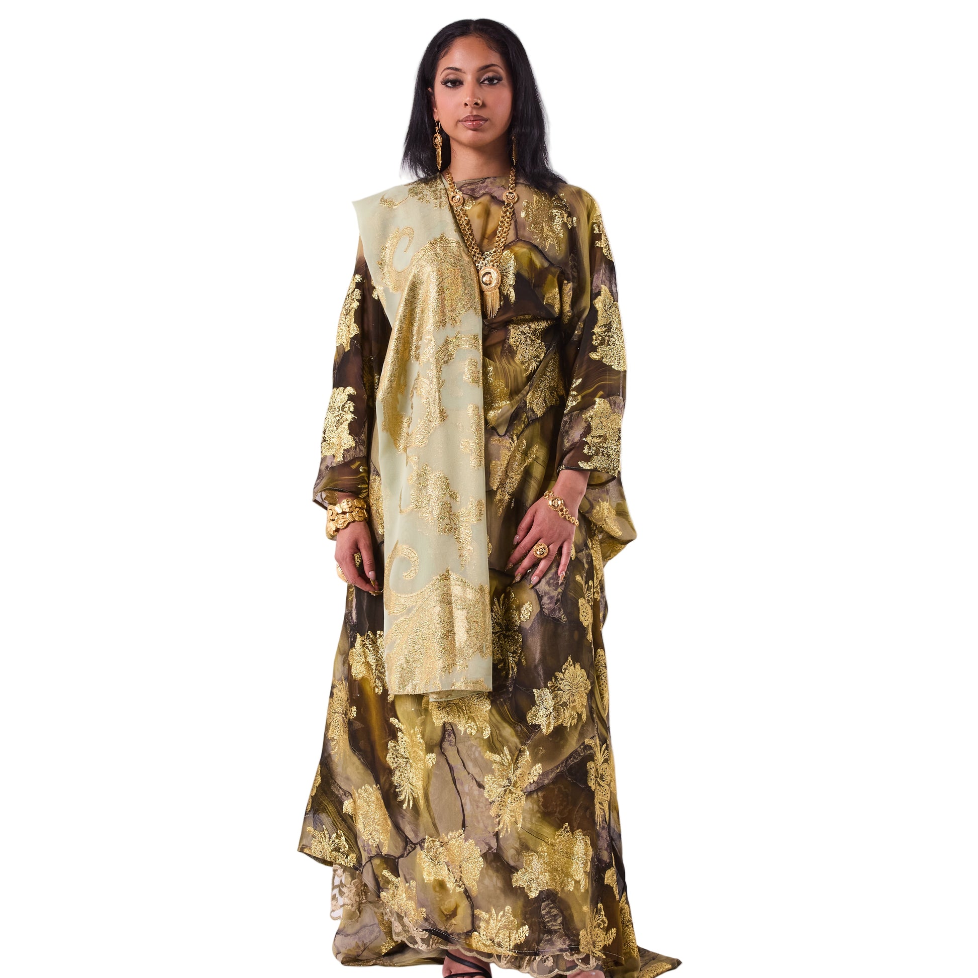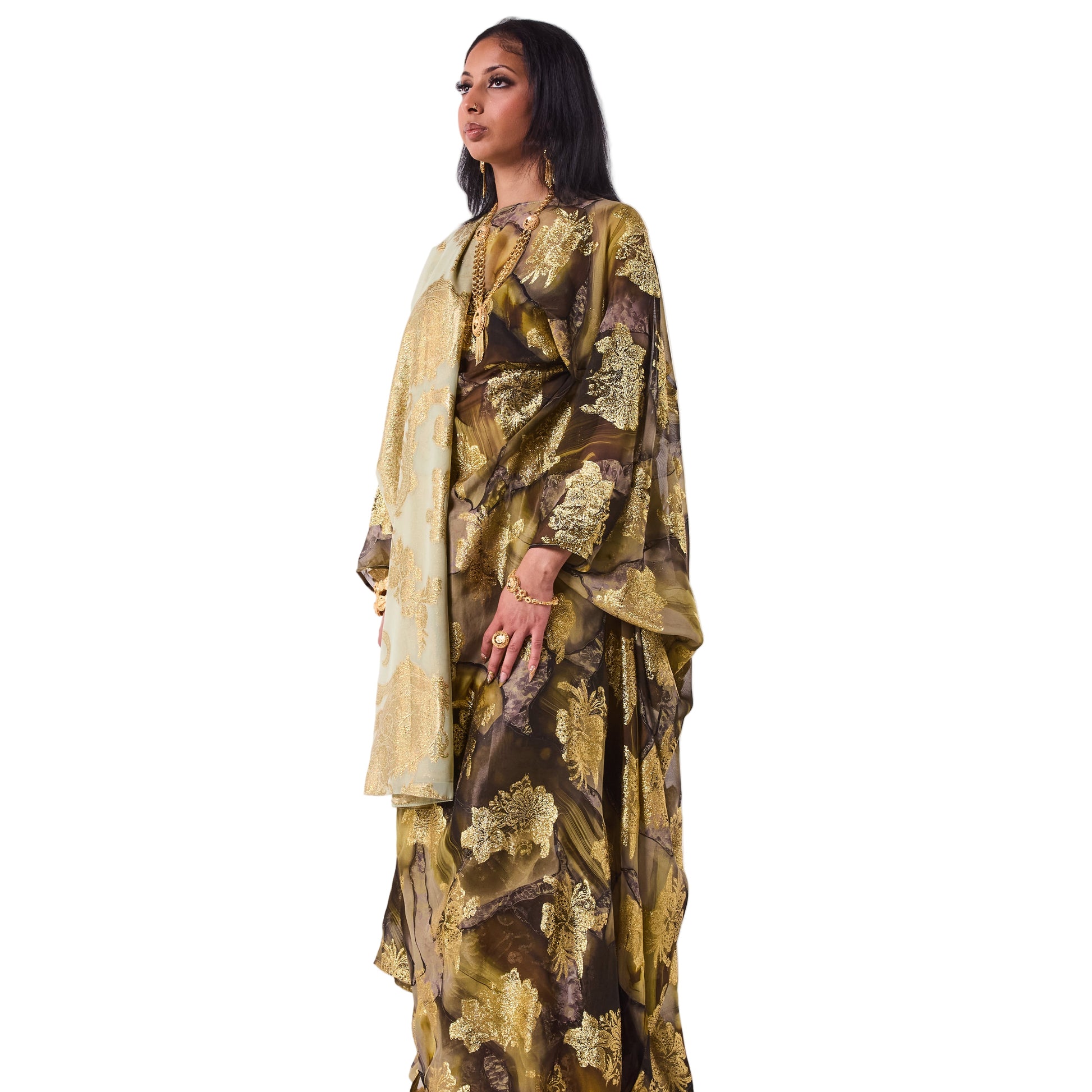 This Dirac blends deep olive and charcoal tones with bold gold floral detailing across the fabric. Finished with a soft sage scarf, it has a rich and refined look.