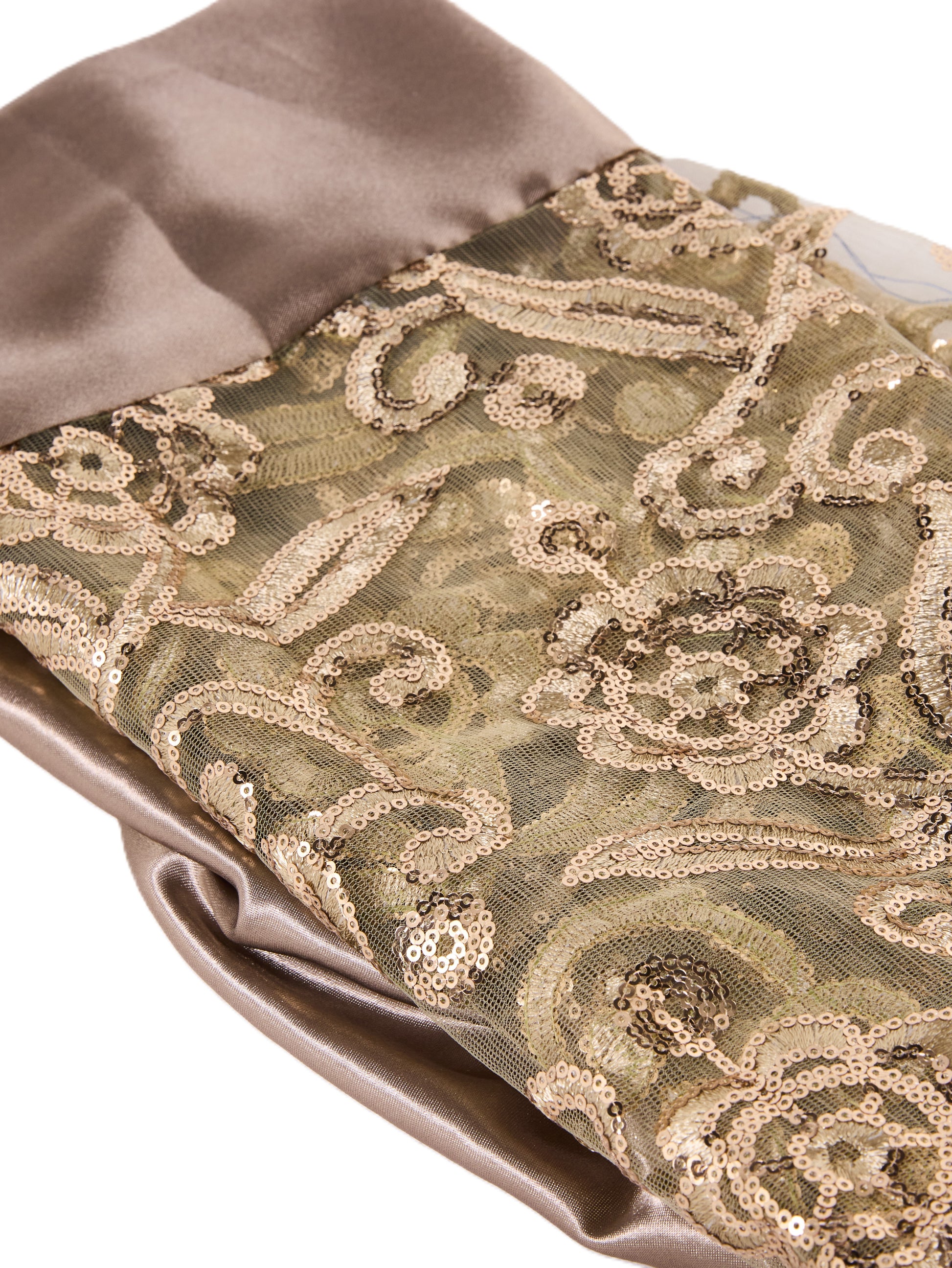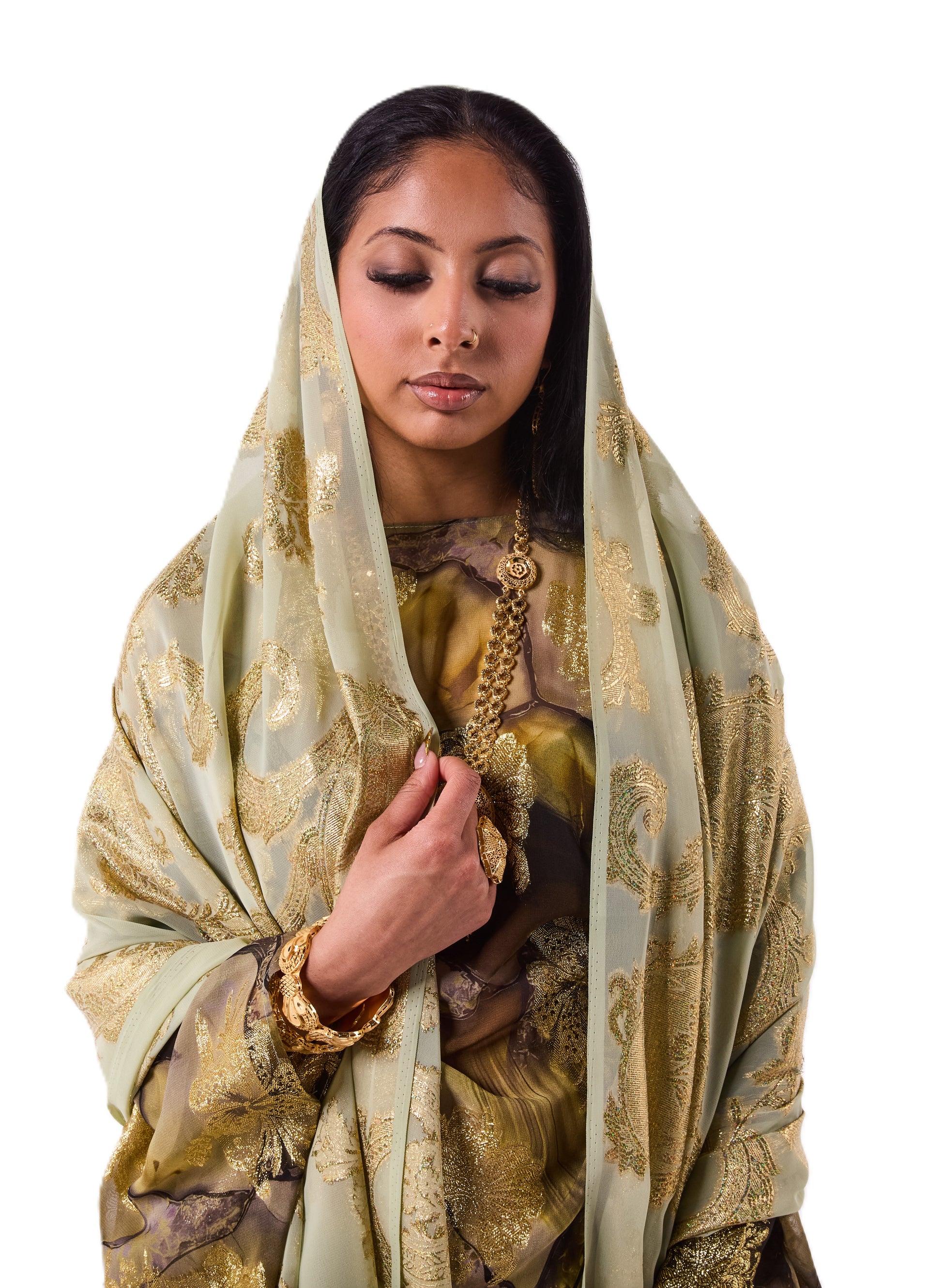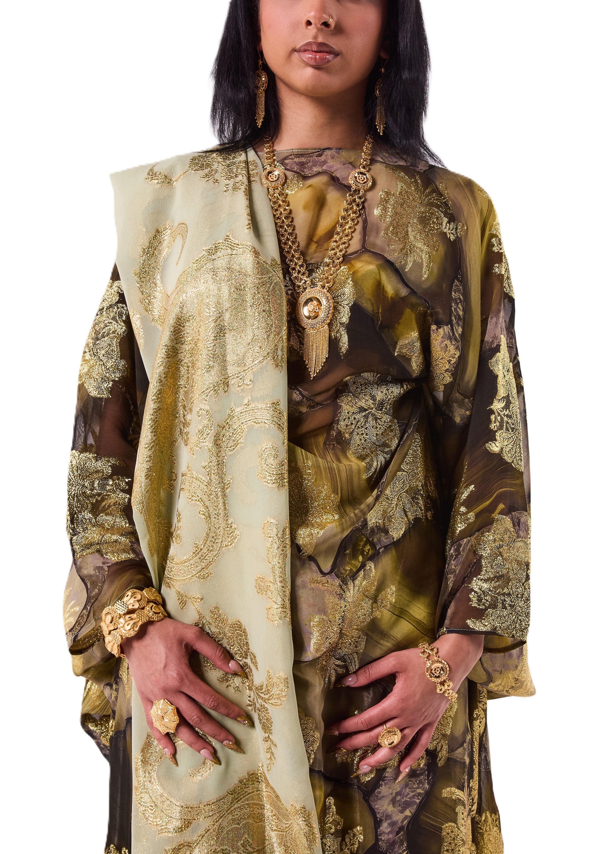 This Dirac blends deep olive and charcoal tones with bold gold floral detailing across the fabric. Finished with a soft sage scarf, it has a rich and refined look.